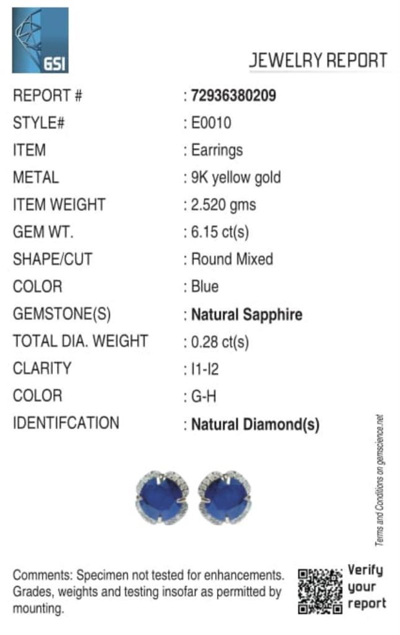 9CT YELLOW GOLD NATURAL BLUE SAPPHIRE & DIAMOND EARRINGS Weight Of The Item: 2.52 GFineness Of Metal(S): Yellow Gold 9KtThe Earrings Consists Of (2) Round Brilliant Natural Blue Sapphire. Surrounding The Main Stones Are Round Brilliant Cut Natural Diamonds.Identification: Natural Blue SapphireColor: BlueShape: Round Brilliant CutNo. Of Stone: 2Dimension: 8 Mm X 8 Mm X 4.8 MmWeight: 6.15 CaratsCut: Very GoodIdentification: Natural DiamondShape: Round Brilliant CutWeight: 0.28 CtsCertificates Are Provided By Gemological Science International (Gsi), An Independent Third-Party Gemological Laboratory Based In The Usa And Recognised Among The Top 10 Gem Labs Globally Condition: Good - Refer Images 0160841+60