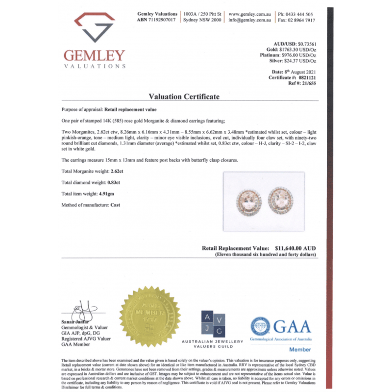 14K ROSE GOLD, MORGANITE AND DIAMOND, DOUBLE HALO STUD EARRINGS The Centres Feature, 2 Oval Cut, Light Pinkish-Orange, Morganites (2.62Ct Tsw, Minor Eye Visible Inclusions), 4 Claw Set. Surrounding The Centres In Double Halos Are, 92 Round Brilliant Cut, Diamonds (0.83Ct Tdw, H-J Colour, Si2-I2 Clarity), Claw Set In White Gold. The Earrings Have Post Backs With 14K Rose Gold Butterfly Clasps. Jewellery Valuations Provided By A Third Party Professional Not Directly Associated With Lloyds Auctions at AUD $11,640.00This Insurance Valuation has been provided by a registered Jewellery Valuer and is intended for insurance purposes only. The valuation amount has no bearing on the auction value of the item. Any questions regarding the valuation should be directed to the issuing Valuer (refer to contact details on the certificate) as Lloyds have no association or relationship with the Valuer or the valuation amount contained within the valuation. Condition: GOOD 0645897+1391