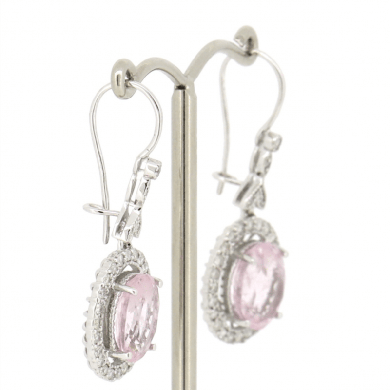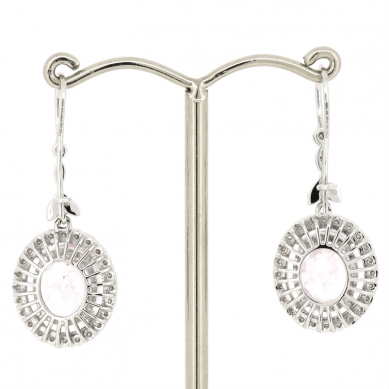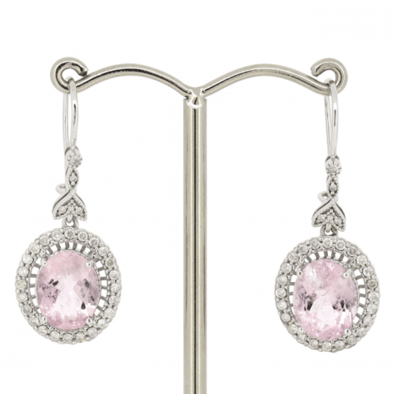 14K WHITE GOLD, MORGANITE AND DIAMOND, DROP EARRINGS The Centres Feature, 2 Oval Cut, Purplish-Pink, Morganites (5.26Ct Tsw, Moderate Eye Visible Inclusions), Claw Set. Surrounding The Centres In A Halo And Decorating The Drops Are, 56 Round Brilliant Cut, Diamonds (0.55Ct Tdw, H-J Colour, Si2-I2 Clarity), Bezel/Bead/Micro-Claw Set With Millegrain Detail. The Earrings Have Latch Back Closures. Jewellery Valuations Provided By A Third Party Professional Not Directly Associated With Lloyds Auctions at AUD $9,890.00This Insurance Valuation has been provided by a registered Jewellery Valuer and is intended for insurance purposes only. The valuation amount has no bearing on the auction value of the item. Any questions regarding the valuation should be directed to the issuing Valuer (refer to contact details on the certificate) as Lloyds have no association or relationship with the Valuer or the valuation amount contained within the valuation. Condition: GOOD 0645897+1344