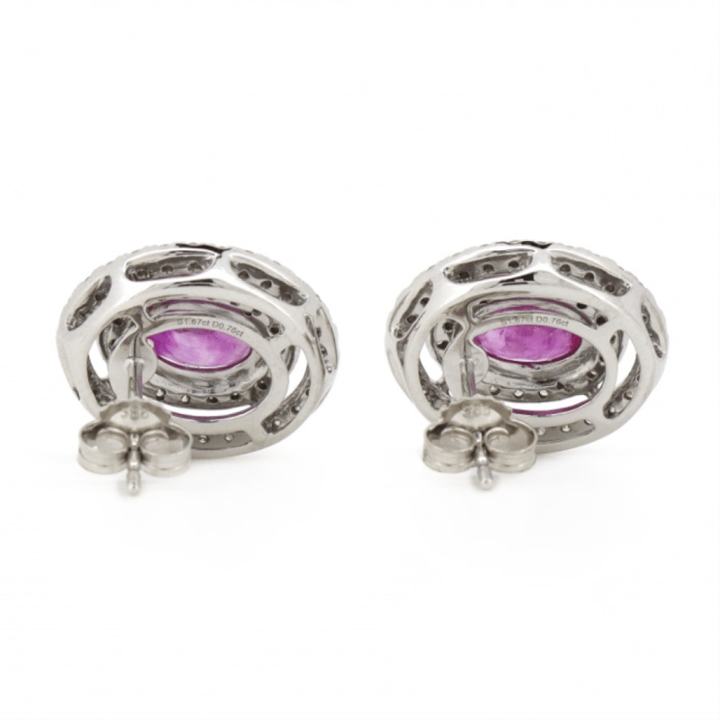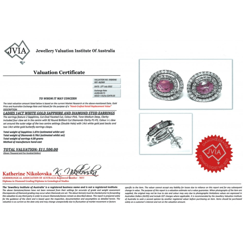 14K WHITE GOLD, PINK SAPPHIRE AND DIAMOND, DOUBLE HALO STUD EARRINGS The Centres Feature, 2 Oval Faceted Cut, Medium Deep Pink, Sapphires (1.67Ct Tsw, Included), 4 Claw Set. Surrounding The Centres In Double Halos Are, 92 Round Brilliant Cut, Diamonds (0.76Ct Tdw, J-L Colour, P1-P2 Clarity), Claw Set. The Earrings Have Post Backs, With 14K White Gold Butterfly Clasps. New. Jewellery Valuations Provided By A Third Party Professional Not Directly Associated With Lloyds Auctions at AUD $11,500.00This Insurance Valuation has been provided by a registered Jewellery Valuer and is intended for insurance purposes only. The valuation amount has no bearing on the auction value of the item. Any questions regarding the valuation should be directed to the issuing Valuer (refer to contact details on the certificate) as Lloyds have no association or relationship with the Valuer or the valuation amount contained within the valuation. Condition: GOOD 0645897+1390