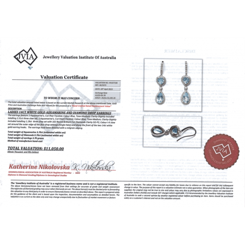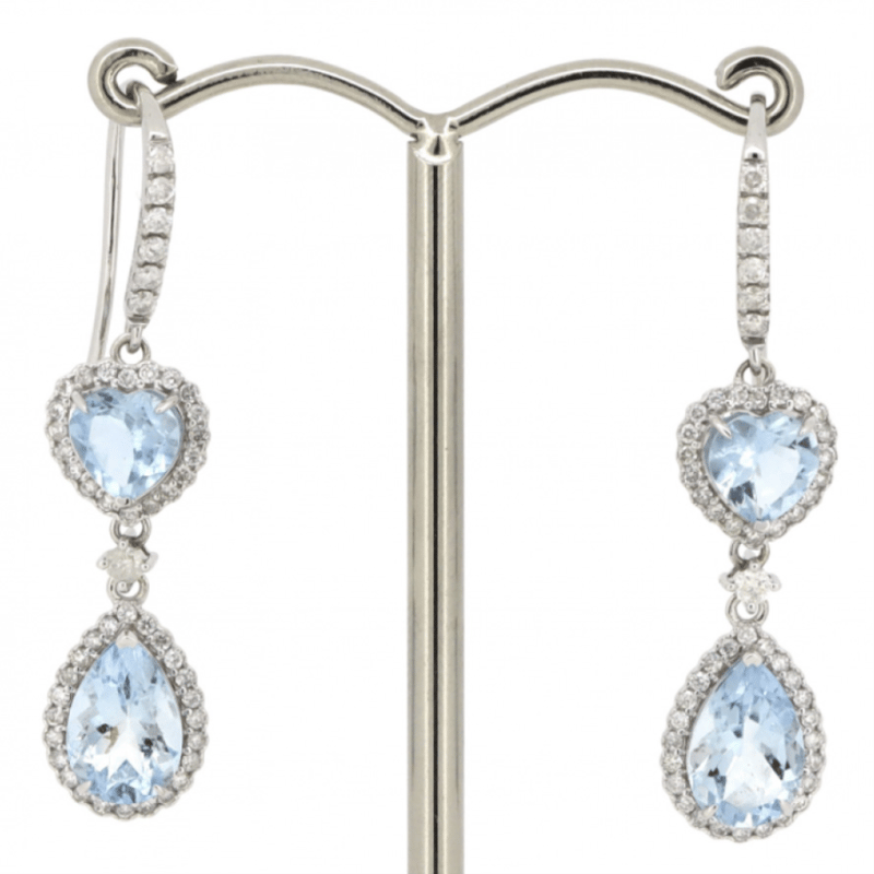 14K WHITE GOLD, AQUAMARINE AND DIAMOND, HALO DOUBLE DROP EARRINGS The Centres Feature, 2 Pear Faceted And 2 Heart Faceted Cut, Medium Blue, Aquamarines (3.70Ct Tsw, Slightly Included), 3-Claw Set. Surrounding The Centres In Halos And Decorating The Hooks Are, 102 Round Brilliant Cut, Diamonds (0.70Ct Tdw, I-K Colour, Si2-P2 Clarity), Claw Set. The Earrings Have Shepherd Hooks. Jewellery Valuations Provided By A Third Party Professional Not Directly Associated With Lloyds Auctions at AUD $11,050.00This Insurance Valuation has been provided by a registered Jewellery Valuer and is intended for insurance purposes only. The valuation amount has no bearing on the auction value of the item. Any questions regarding the valuation should be directed to the issuing Valuer (refer to contact details on the certificate) as Lloyds have no association or relationship with the Valuer or the valuation amount contained within the valuation. Condition: GOOD 0645897+1330
