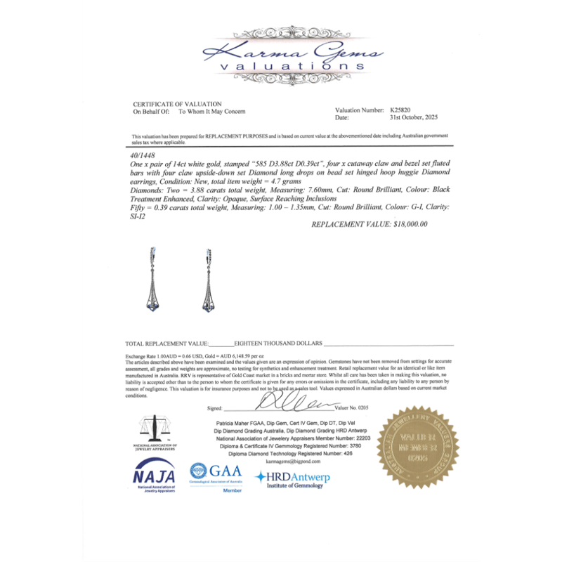 This Insurance Valuation has been provided by a registered Jewellery Valuer and is intended for insurance purposes only. The valuation amount has no bearing on the auction value of the item. Any questions regarding the valuation should be directed to the issuing Valuer (refer to contact details on the certificate) as Lloyds have no association or relationship with the Valuer or the valuation amount contained within the valuation.