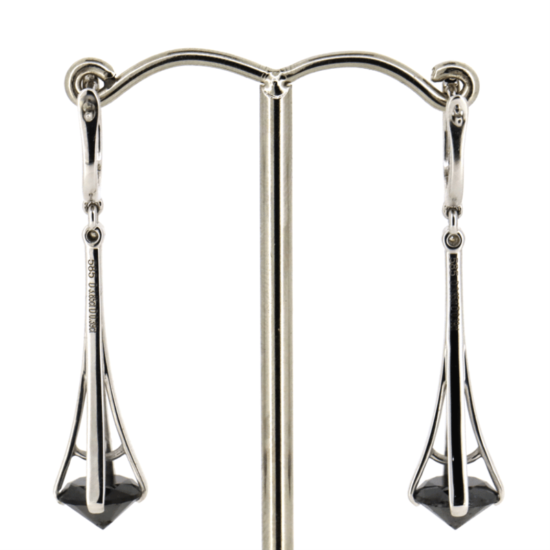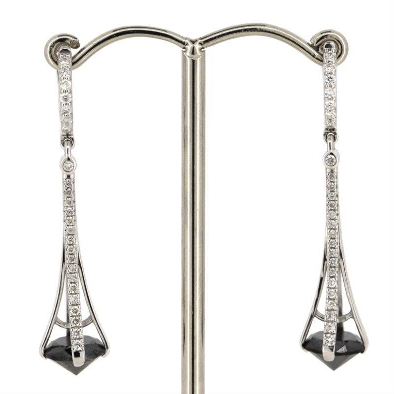 The Centres Feature, 2 Round Brilliant Cut, Black, Diamonds (3.88Ct Tdw, Opaque), Claw Set. Decorating The Drop And Hooks Are, 50 Round Brilliant Cut, Diamonds (0.39Ct Tdw, G-I Colour, Si-I2 Clarity), Bead Set. The Earrings Feature Half Hooped Hinged Clips.