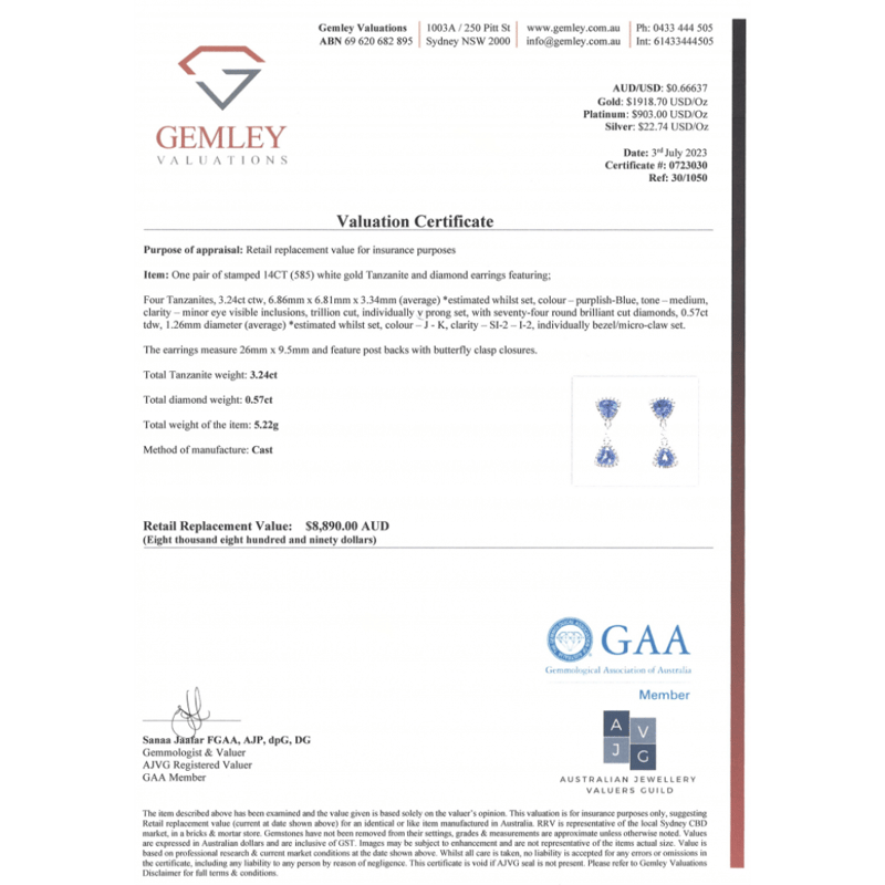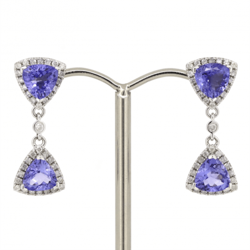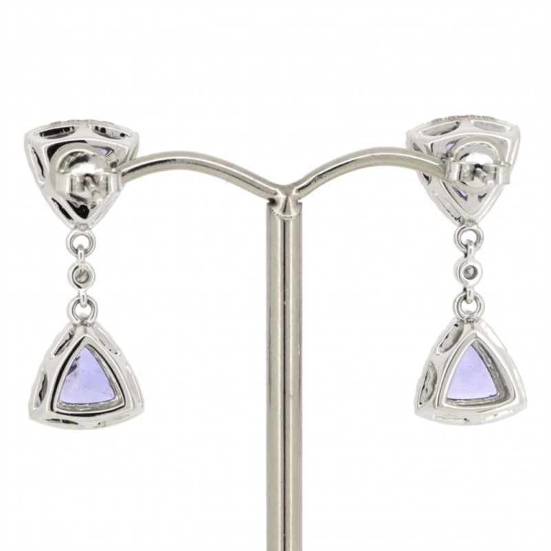The Design Features, 4 Trillion Cut, Medium Purplish-Blue, Tanzanites (3.24Ct Tsw, Minor Eye Visible Inclusions), Claw Set. Surrounding The Centres In Halos And Decorating The Joins Are, 74 Round Brilliant Cut, Diamonds (0.57Ct Tdw, J-K Colour, Si2-I2 Clarity), Bezel/Micro-Claw Set. The Earrings Have Post Backs, With 14K White Gold Butterfly Clasps.