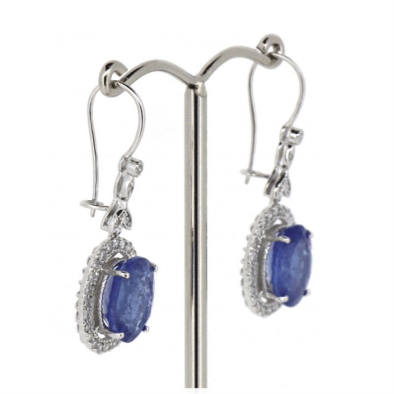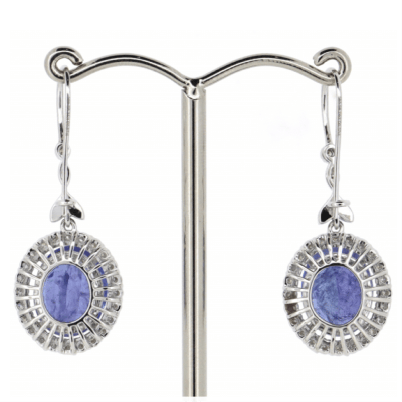 The Centres Feature, 2 Oval Cut, Medium Violetish-Blue Tanzanites (8.24Ct Tsw, Moderate Eye Visible Inclusions), 4 Claw Set. Surrounding The Centres In A Halo And Decorating The Join Of The Hook Are, 56 Round Brilliant Cut, Diamonds (0.57Ct Tdw, J-K Colour, Si2-I2 Clarity), Micro-Claw Set/Bead Set With Millegrain Detail. The Earrings Have Latch Backs.