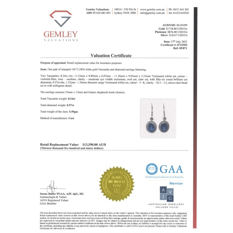 This Insurance Valuation has been provided by a registered Jewellery Valuer and is intended for insurance purposes only. The valuation amount has no bearing on the auction value of the item. Any questions regarding the valuation should be directed to the issuing Valuer (refer to contact details on the certificate) as Lloyds have no association or relationship with the Valuer or the valuation amount contained within the valuation.