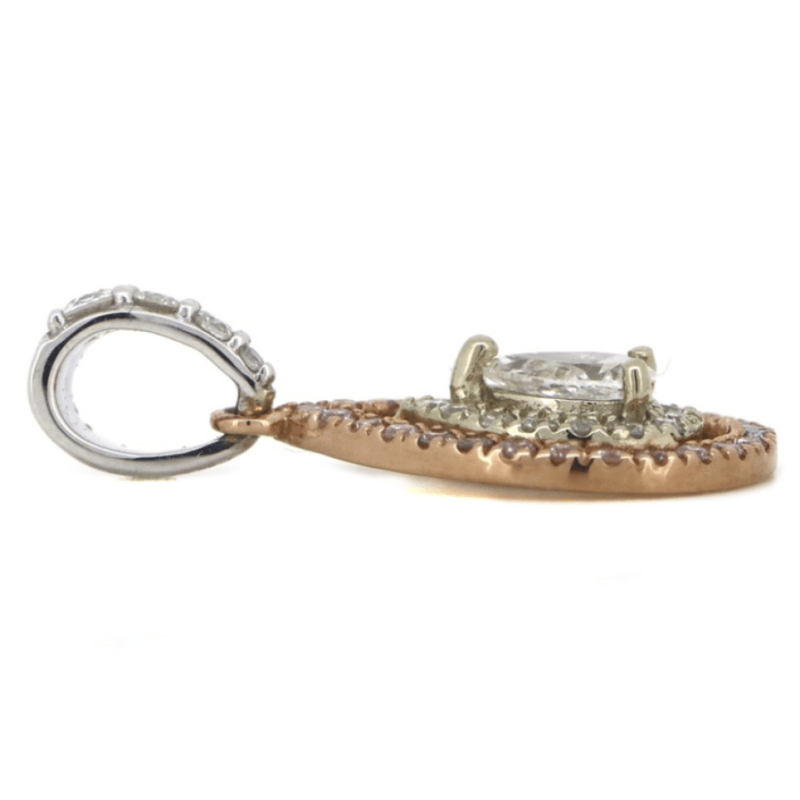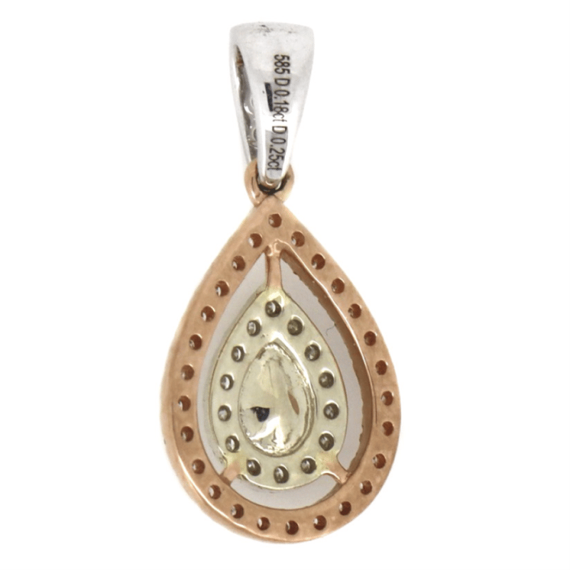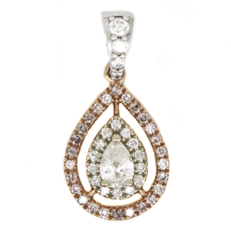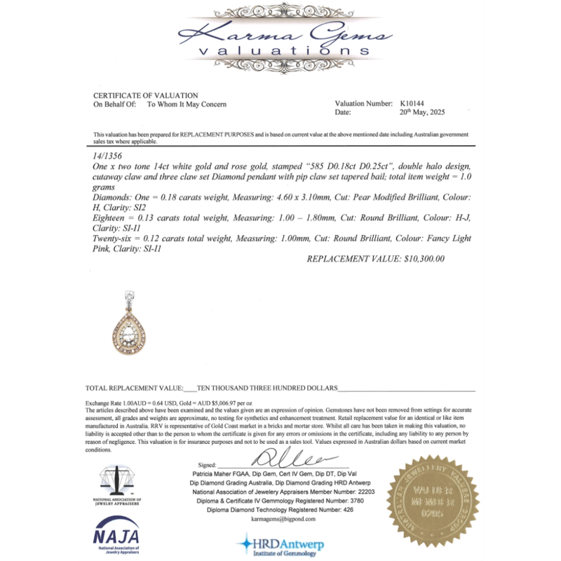 14K WHITE/ROSE GOLD, PINK DIAMOND AND DIAMOND, DOUBLE HALO PENDANT The Design Features, One Pear Modified Brilliant Cut, Diamond (0.18Ct, H-Colour, Si2-Clarity), 3 Claw Basket Set. Surrounding The Centre In The Inner Halo And Decorating The Bail Are, 18 Round Brilliant Cut, Diamonds (0.13Ct Tdw, H-J Colour, Si-I1 Clarity), Micro-Claw Set. Surrounding The Centre In An Outer Halo Are 26 Round Brilliant Cut, Fancy Light Pink, Diamonds (0.12Ct Tdw, Si-I1 Clarity), Pip-Claw Set. Jewellery Valuations Provided By A Third Party Professional Not Directly Associated With Lloyds Auctions at AUD $10,300.00This Insurance Valuation has been provided by a registered Jewellery Valuer and is intended for insurance purposes only. The valuation amount has no bearing on the auction value of the item. Any questions regarding the valuation should be directed to the issuing Valuer (refer to contact details on the certificate) as Lloyds have no association or relationship with the Valuer or the valuation amount contained within the valuation. Condition: GOOD 0645897+1302