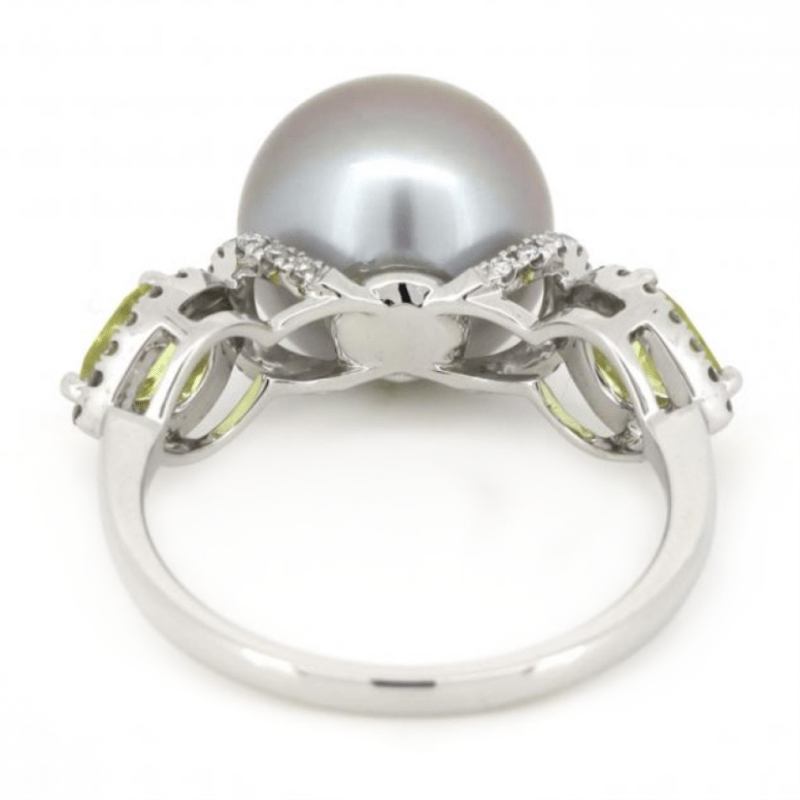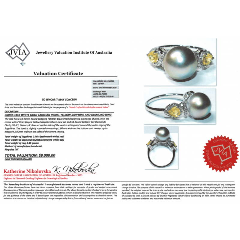 14K WHITE GOLD, BLACK CULTURED TAHITIAN PEARL, YELLOW SAPPHIRE AND DIAMOND, RING The Centre Features, One Near Round, Black With Pink Overtones, Cultured Tahitian Pearl (10.40Mm Size). Either Side Of The Centre Are, 2 Pear Cut, Yellow, Sapphires (0.76Ct Tsw), 3 Claw Set. Surrounding The Sapphires In Halos And Decorating The Setting Are, 54 Round Brilliant Cut, Diamonds (0.20Ct Tdw, J-K Colour, Si1-P1 Clarity), Claw Set. Ring Size M. Jewellery Valuations Provided By A Third Party Professional Not Directly Associated With Lloyds Auctions at AUD $9,000.00This Insurance Valuation has been provided by a registered Jewellery Valuer and is intended for insurance purposes only. The valuation amount has no bearing on the auction value of the item. Any questions regarding the valuation should be directed to the issuing Valuer (refer to contact details on the certificate) as Lloyds have no association or relationship with the Valuer or the valuation amount contained within the valuation. Condition: GOOD 0645897+1320