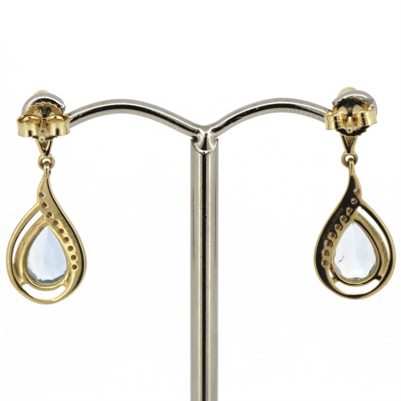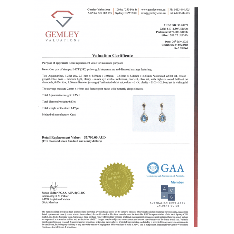 14K YELLOW GOLD, AQUAMARINE AND DIAMOND, EARRINGS The Centres Feature, 2 Pear Cut, Greyish-Blue, Aquamarines (1.25Ct Tsw, Minor Eye Visible Inclusions), Claw Set. Decorating The Centres Are, 18 Round Brilliant Cut, Diamonds (0.07Ct Tdw, J-K Colour, Si2-I2 Clarity), Bead Set In White Gold. The Earrings Have Post Backs With 14K Yellow Gold Butterfly Clasps. Jewellery Valuations Provided By A Third Party Professional Not Directly Associated With Lloyds Auctions at AUD $5,790.00This Insurance Valuation has been provided by a registered Jewellery Valuer and is intended for insurance purposes only. The valuation amount has no bearing on the auction value of the item. Any questions regarding the valuation should be directed to the issuing Valuer (refer to contact details on the certificate) as Lloyds have no association or relationship with the Valuer or the valuation amount contained within the valuation. Condition: GOOD 0645897+1326
