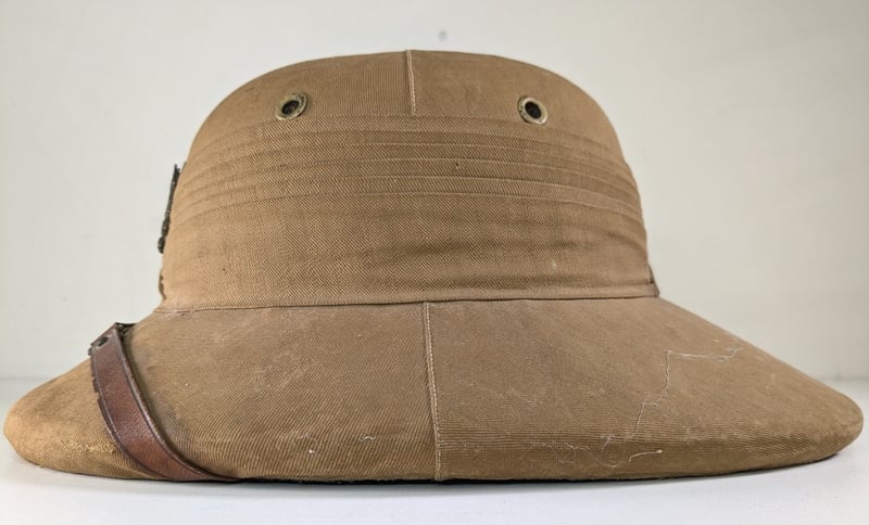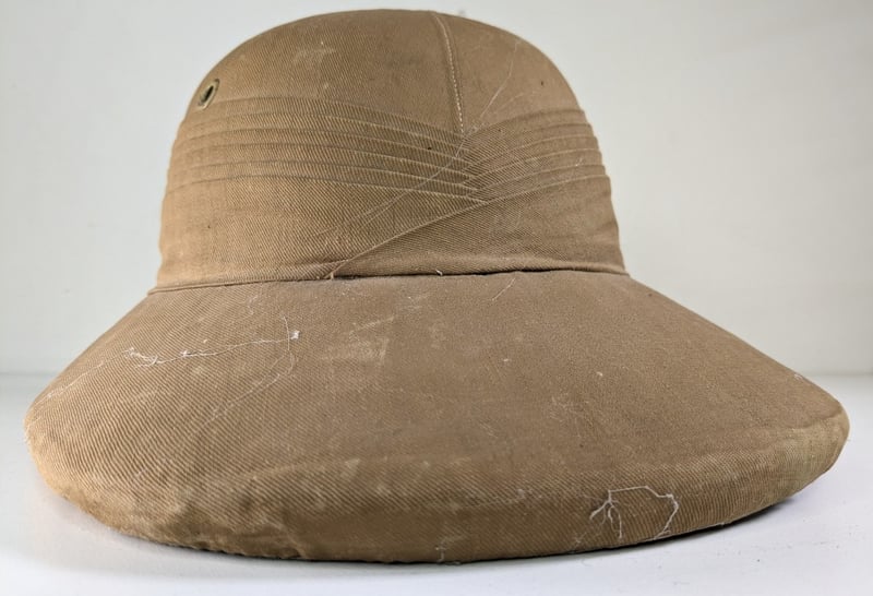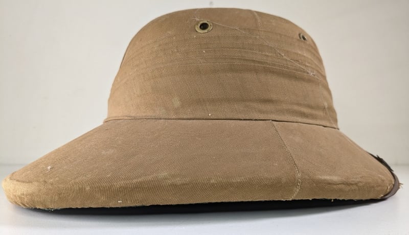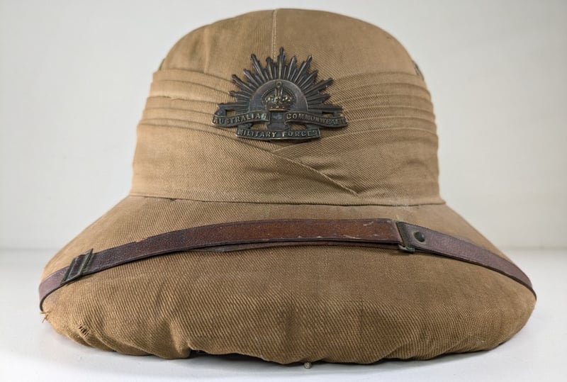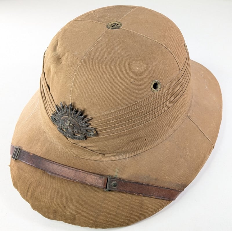 WW1 AUSTRALIAN TROPICAL PITH HELMET UK TIP TAFT SLIDER BADGE SOME REPAIR/DAMAGE TO HELMETItem Size: Height: 35cm, Width: 28cm, Depth: 26cm, Weight: 1KgCondition: Good - Refer To ImagesFC1B163013+108