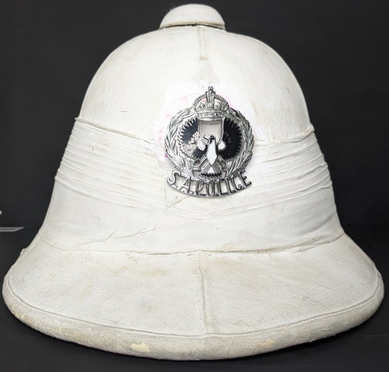 SOUTH AUSTRALIAN POLICE 1960'S WHITE PITH HELMET WITH BADGE IN CARRY TINItem Size: Height: 22cm, Width: 30cm, Depth: 40cm, Weight: 1KgCondition: Good - Refer To ImagesFC1B163013+153
