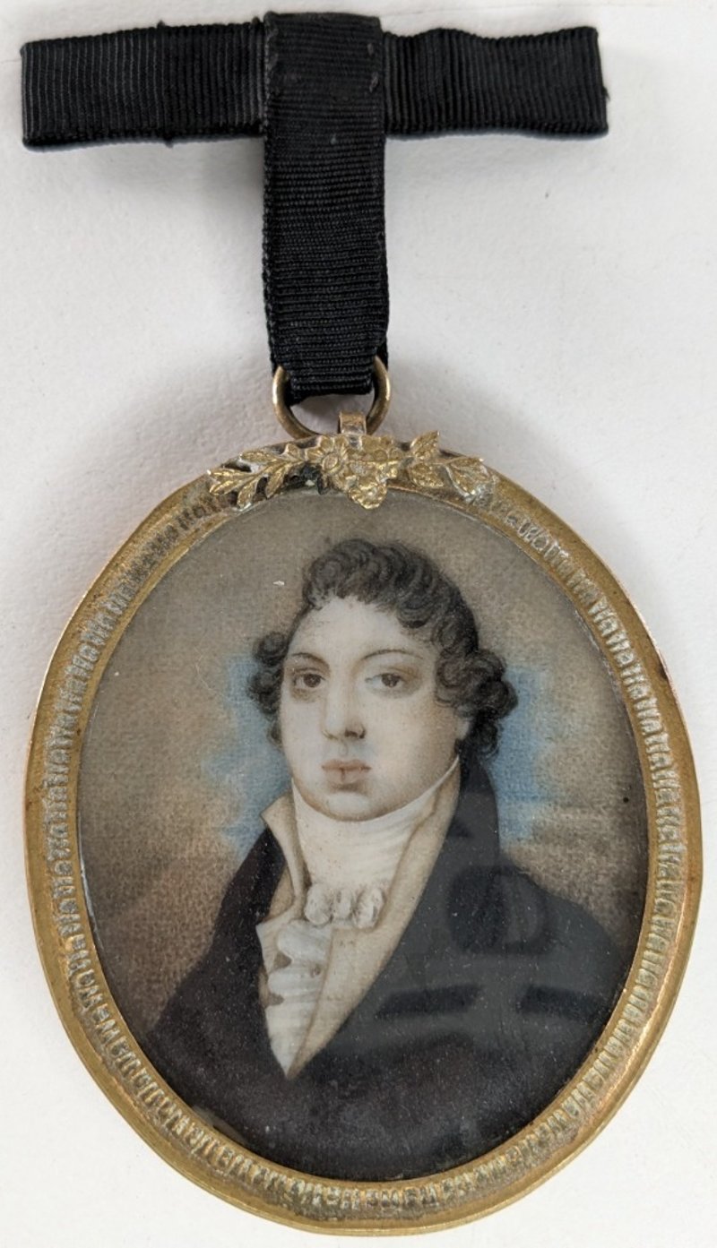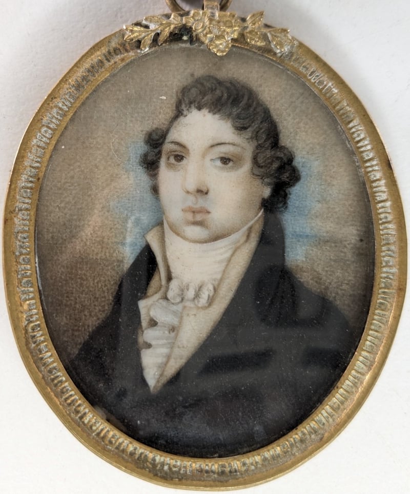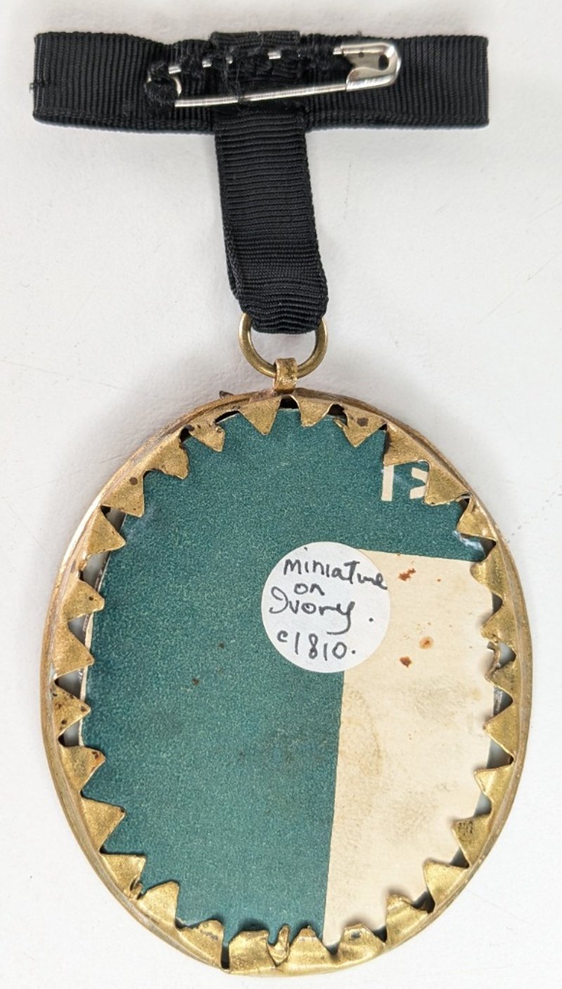 RARE 1810 PAINTED MINIATURE IN FRAME OF GENTLEMAN WITH MOURNING RIBBON ATTACHED.Item Size: Height: 5cm, Width: 5cm, Depth: 5cm, Weight: 0.5KgCondition: Good - Refer To ImagesFC1B163013+63