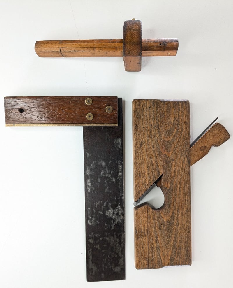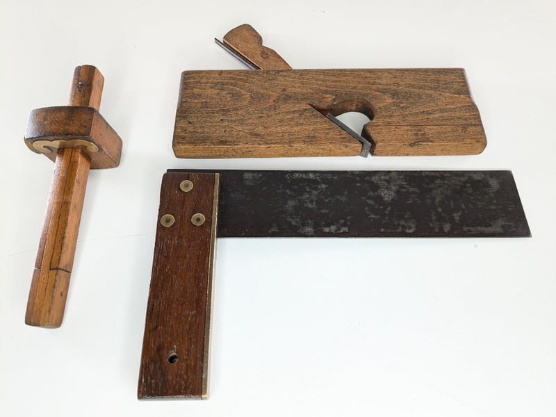 ANTIQUE TOOLS. PLANE, SQUARE AND, MORTIES TOOL.Item Size: Height: 25cm, Width: 8.5cm, Depth: 2cm, Weight: 0.5KgCondition: Good - Refer To ImagesFC1B163013+57