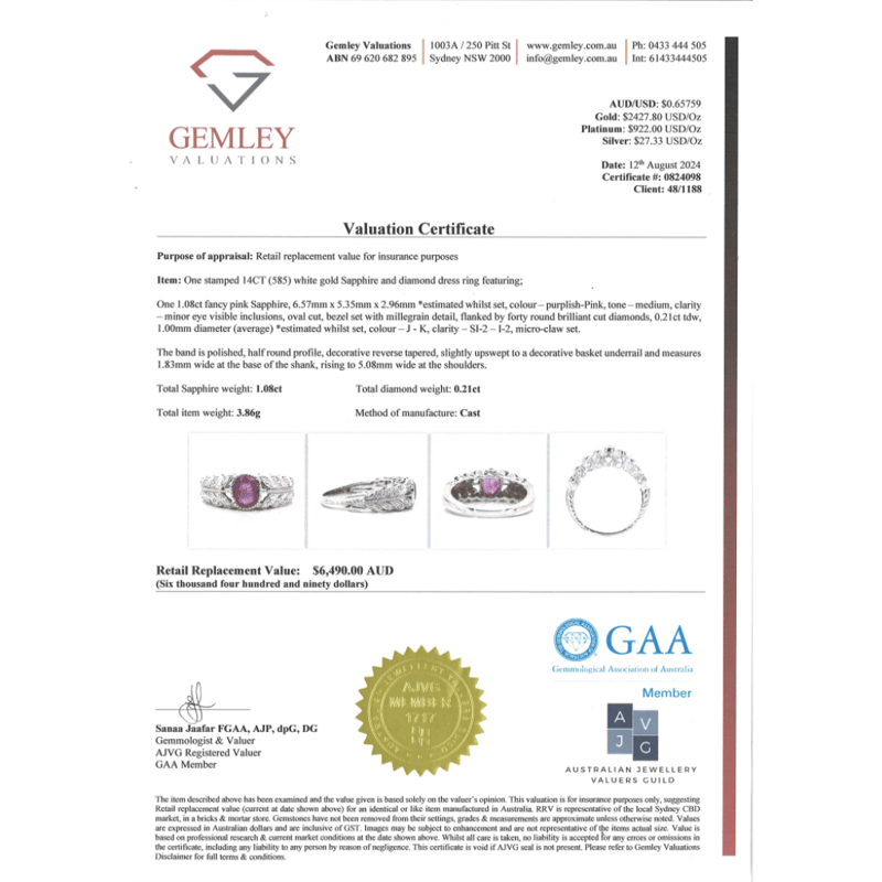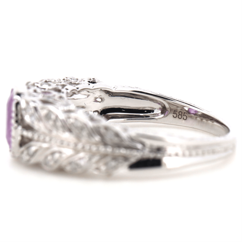 The Centre Design Features, One Oval Faceted Cut, Purplish Pink, Sapphire (1.08Ct, Slightly Included), Bezel Set. Encompassing The Design Are, 40 Round Brilliant Cut, Diamonds (0.21Ct Tdw, J-K Colour, Si2-I2 Clarity), Bead Set. Ring Size O.
