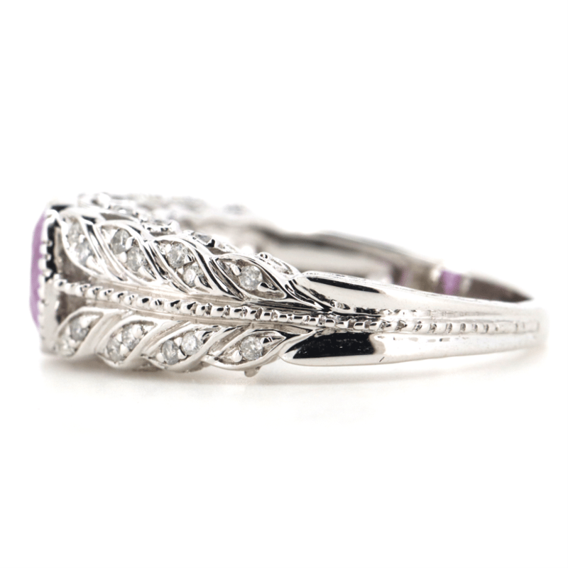 14K WHITE GOLD, PINK SAPPHIRE AND DIAMOND, ART DECO INSPIRED RING.