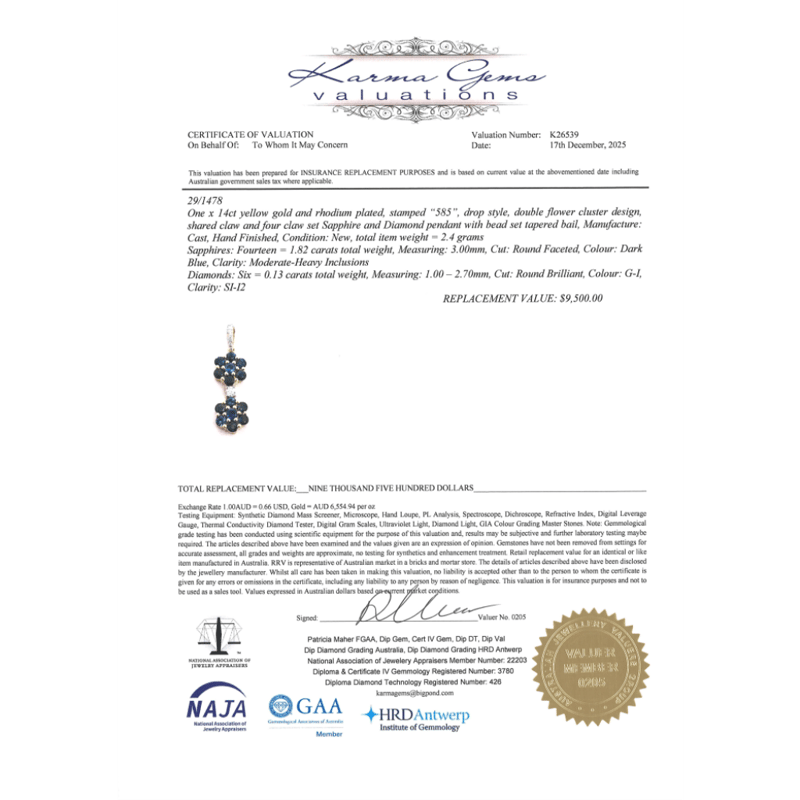 14K YELLOW GOLD, BLUE SAPPHIRE AND DIAMOND, FLORAL DOUBLE DROP PENDANT.
