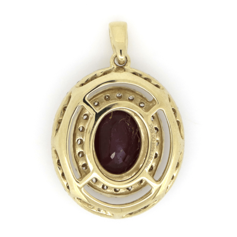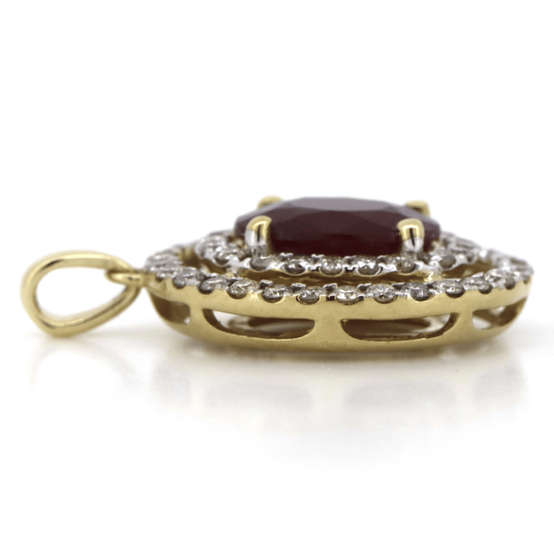 14K YELLOW GOLD, RUBY AND DIAMOND, DOUBLE HALO PENDANT.