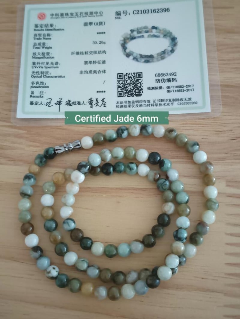 CERTIFIED CHINESE GREEN JADE UNISEX NECKLACE 6MM BEADS WITH CERTIFICATE