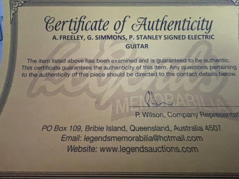 An Electric Guitar Signed On The Pickguard By Gene Simmons, Ace Freeley And Paul Stanley. The Item Is Accompanied By A Certificate Of Authenticity.