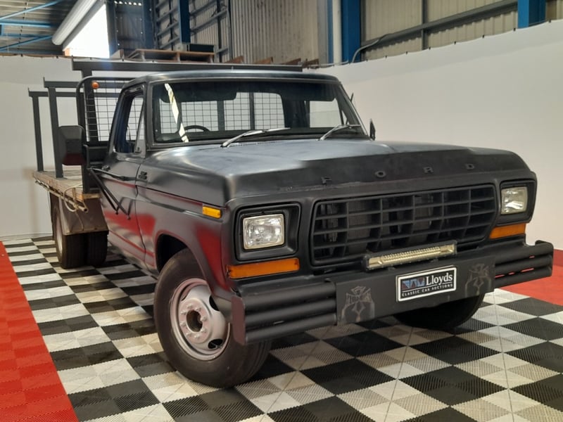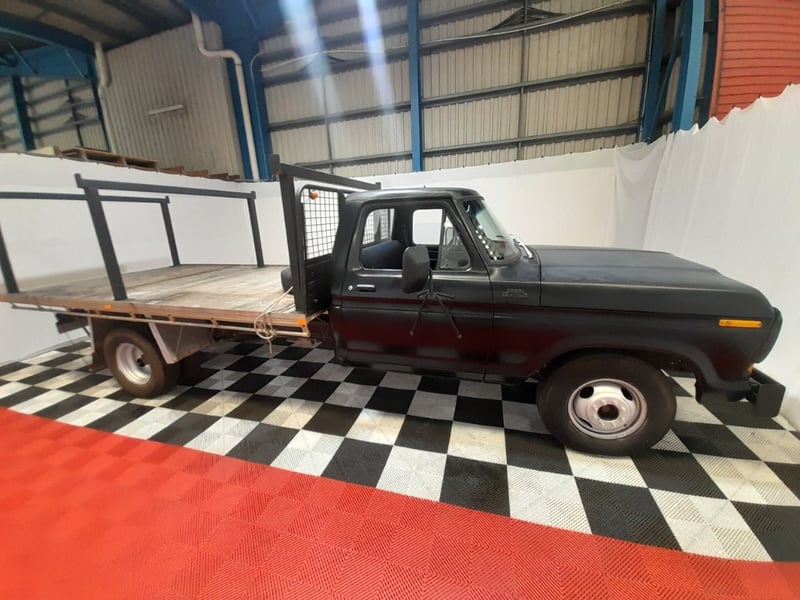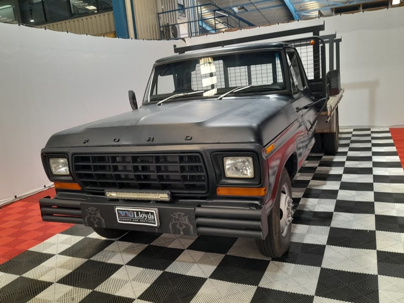 1979 Ford F350 single cab utility finished in Black. Rear‑wheel drive configuration powered by a 350ci (5.7‑litre) V8 petrol engine paired with a 5‑speed manual transmission. Odometer indicating 245,941 kilometres. Seating for three occupants.