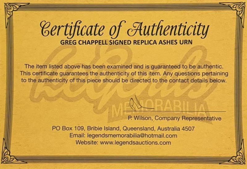 A Replica Ashes Urn Personally Signed By Greg Chappell. Greg Chappell Is A Former Cricketer Who Represented Australia At The International Level In Both Tests And One-Day Internationals. The Item Is Accompanied By A Certificate Of Authenticity.