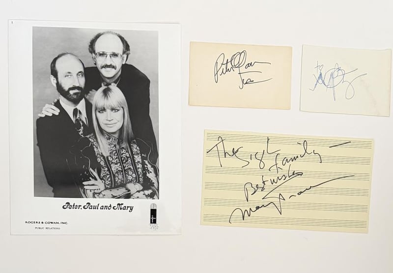 PETER, PAUL AND MARY SIGNED INDEX CARD AND MUSIC SHEET