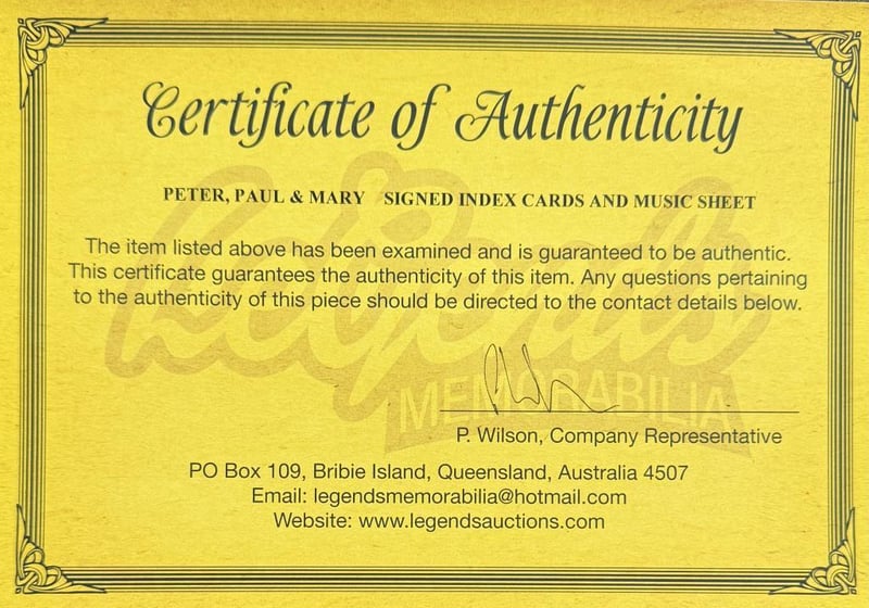Peter, Paul And Mary Personally Signed Index Card And Music Sheet Comes With A 8 X 10 Photo Of Thr Trio. Peter, Paul And Mary Were An American Folk Group Formed In New York City In 1961 During The American Folk Music Revival. The Trio Consisted Of Peter Yarrow, Paul Stookey, And Mary Travers. The Item Is Accompanied By A Certificate Of Authenticity.