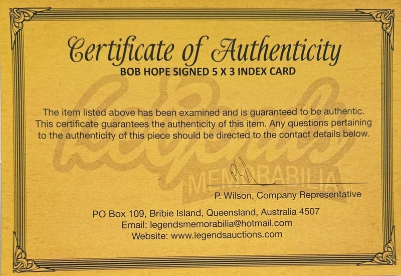 BOB HOPE SIGNED INDEX CARDBob Hope Personally Signed 5 X 3 Index Card Comes With A 8 X 10 Photo. Bob Hope Was A British-Born American Comedian, Actor, Entertainer, And Producer With A Career Spanning Nearly 80 Years. The Item Is Accompanied By A Certificate Of Authenticity.Condition: Good - Refer To Images584418+45