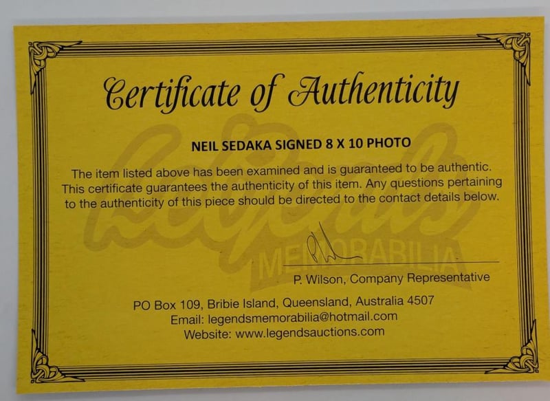 Neil Sedaka Personally Signed 8 X 10 Photo. Neil Sedaka Is An American Singer, Songwriter And Pianist. Since His Music Career Began In 1957, He Has Sold Millions Of Records Worldwide And Has Written Or Co-Written Over 500 Songs For Himself And Other Artists. The Item Is Accompanied By A Certificate Of Authenticity.