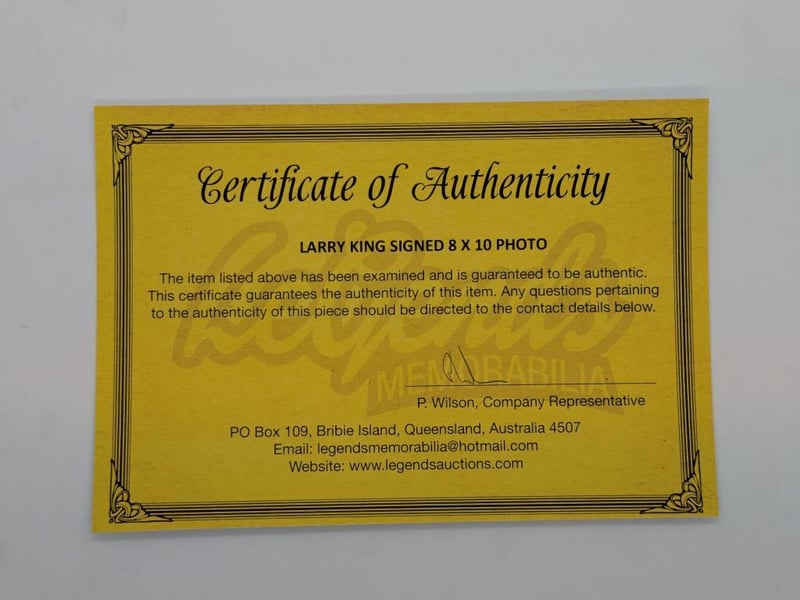 Larry King Personally Signed 8 X 10 Photo. Larry King Was An American Tv And Radio Host, Author, And Former Spokesman. King Was A Wmbm Radio Interviewer In The Miami Area In The 1950S And 1960S. The Item Is Accompanied By A Certificate Of Authenticity.