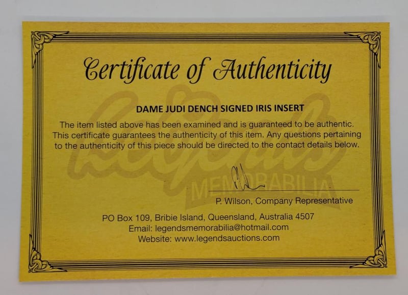 DAME JUDI DENCH SIGNED IRIS INSERT Dame Judi Dench Personally Signed Iris Insert. Dame Judi Dench Is A Retired English Actress. Widely Considered One Of Britain'S Greatest Actresses, Dench Is Known For Her Versatile Roles On Stage And Screen. The Item Is Accompanied By A Certificate Of Authenticity. Condition: Good - Refer To Images 584418+49