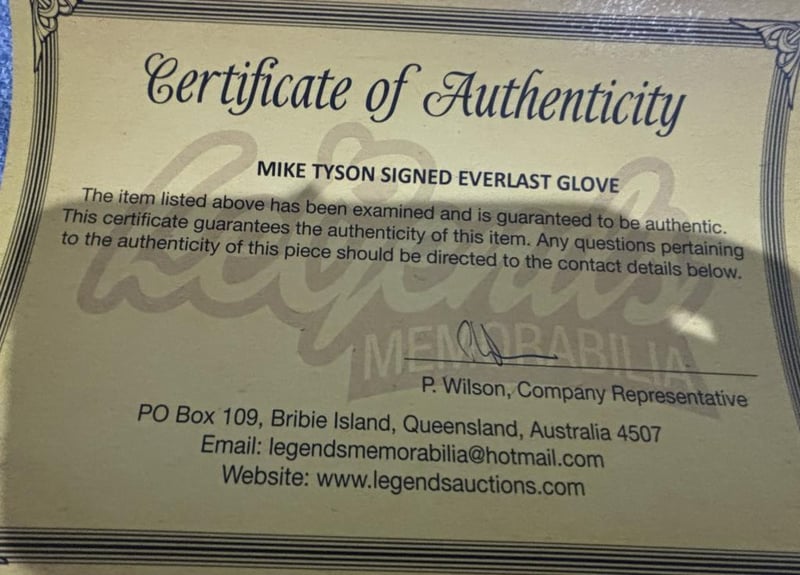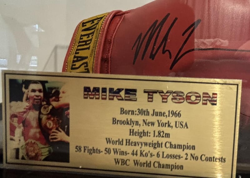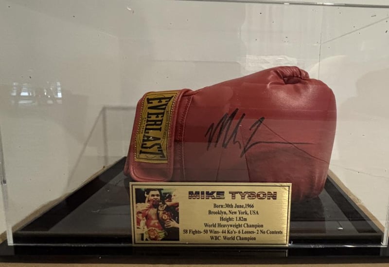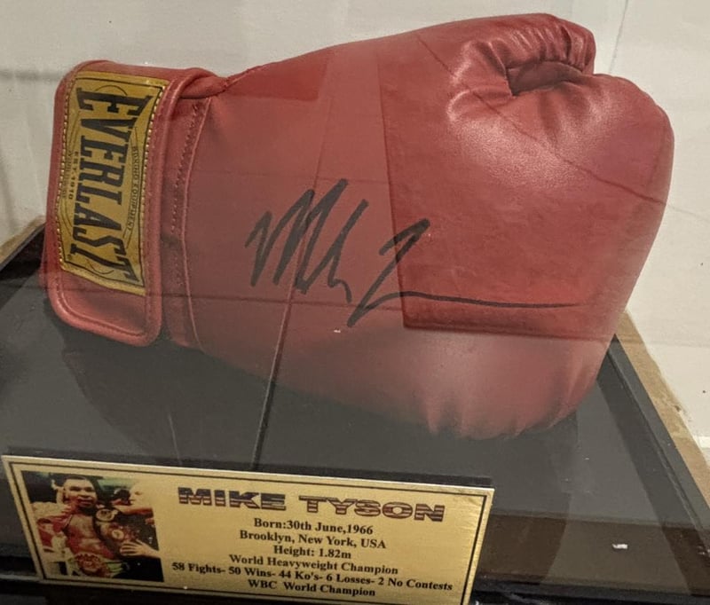 Mike Tyson Personally Signed Everlast Boxing Glove. The Glove Is Presented In An Acrylic Display Case With Gold Statistics Plaque. The Item Is Accompanied By A Certificate Of Authenticity.