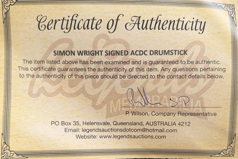 An Acdc Drumstick Personally Signed By Former Drummer Simon Wright. The Item Is Accompanied By A Certificate Of Authenticity.