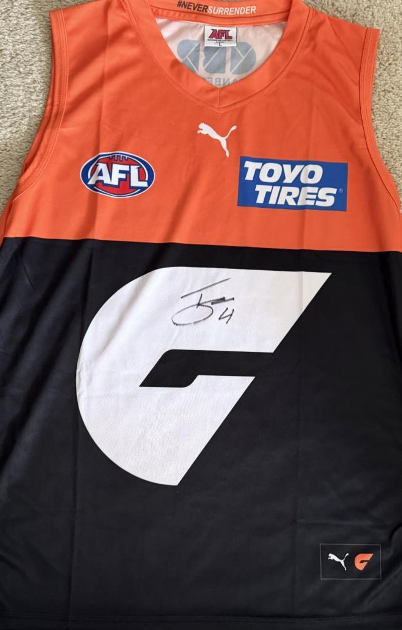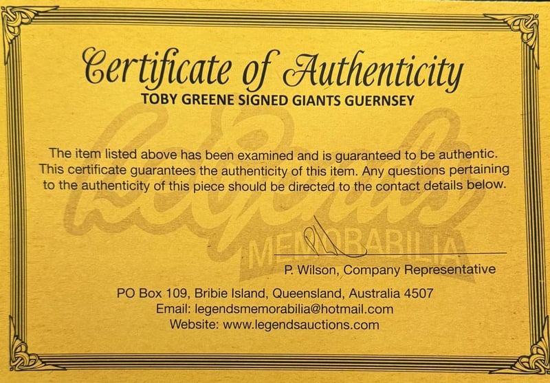 A Sydney Giants Guernsey Personally Signed By Toby Greene. Toby Greene Is A Professional Australian Rules Footballer And The Captain Of The Greater Western Sydney Giants In The Afl. The Item Is Accompanied By A Certificate Of Authenticity.