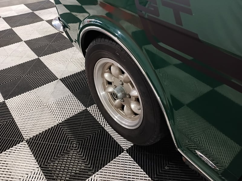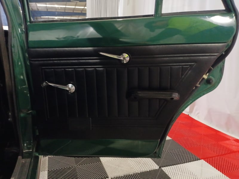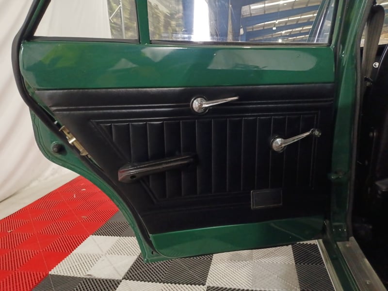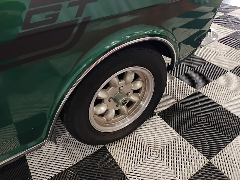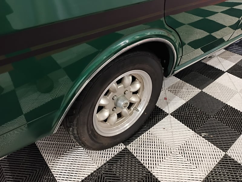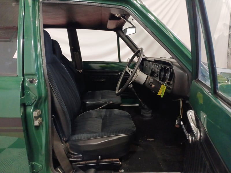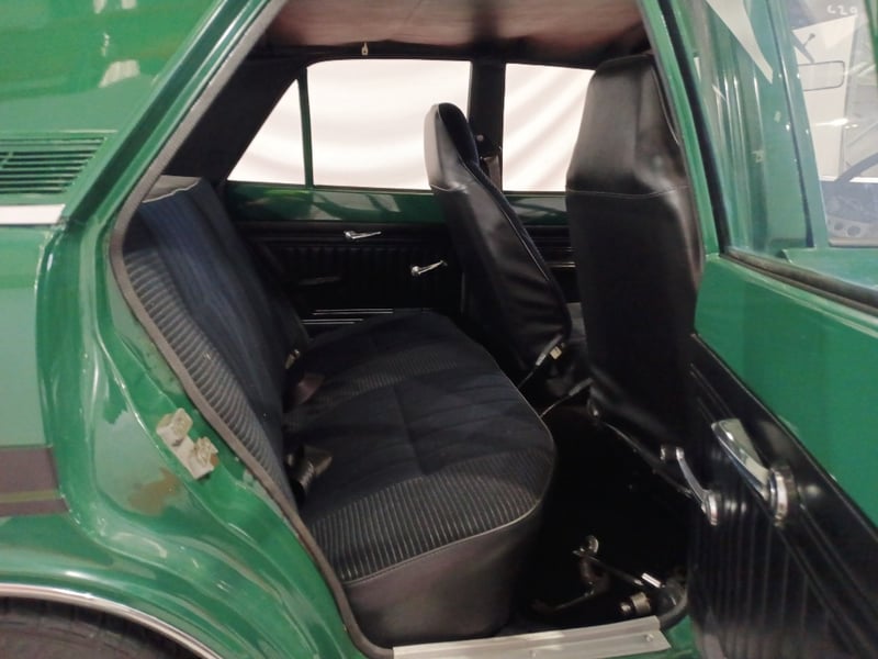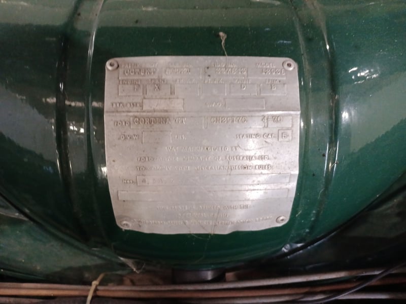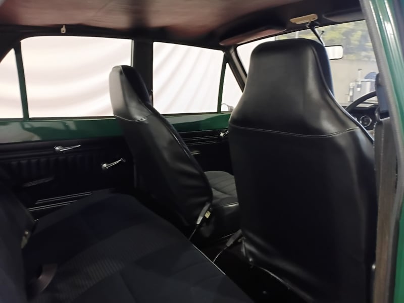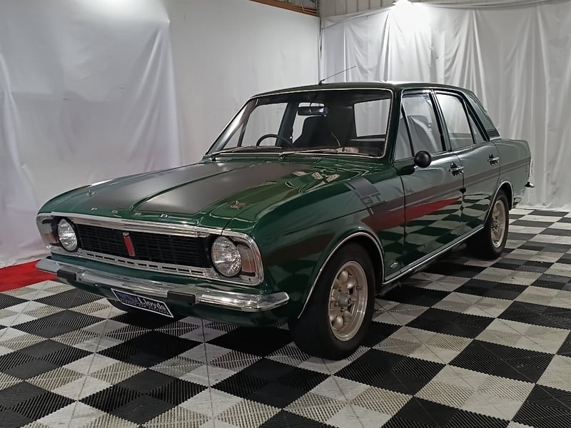 1970 Ford Cortina sedan finished in Green. Rear‑wheel drive configuration powered by a 4‑cylinder petrol engine paired with a 5‑speed manual transmission. Odometer indicating 77,999 kilometres.