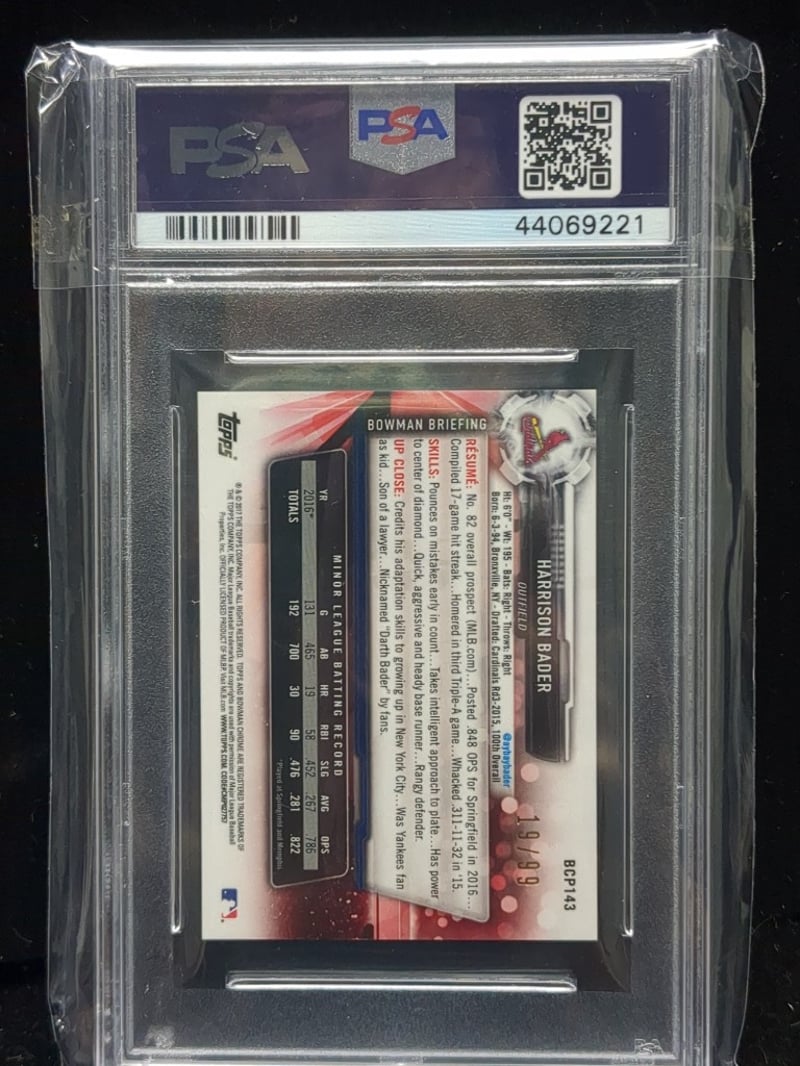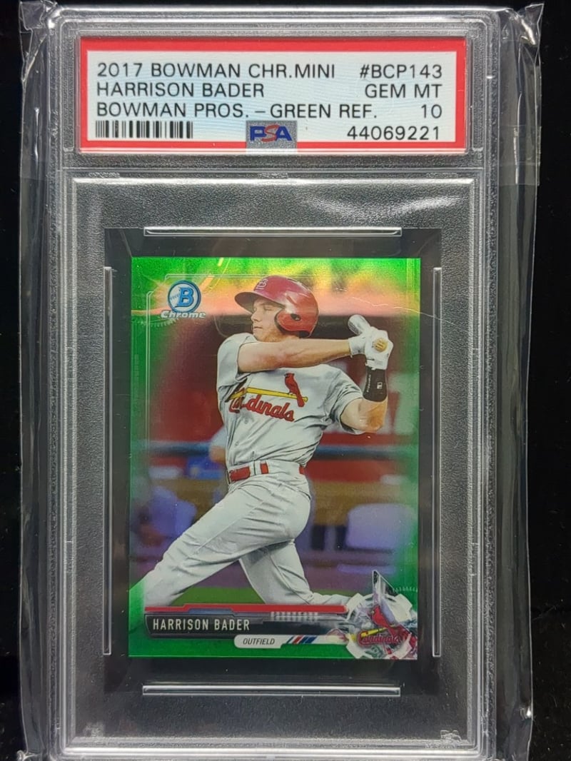 2017 BOWMAN CHROME MINI HARRISON BADER PSA 10 GEM MINT BASEBALL CARD #BCP143Item Size: Height: 6.3cm, Width: 3.8cm, Depth: 0.2cmProfessionally Graded 2017 Bowman Chrome Mini Card Featuring St. Louis Cardinals Outfielder Harrison Bader In Action Pose, Psa Certified Gem Mint Condition With Green Refractor Parallel Variant And Authentication SealCondition: Good - Refer To Images582933+1