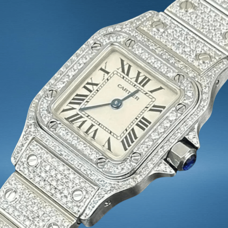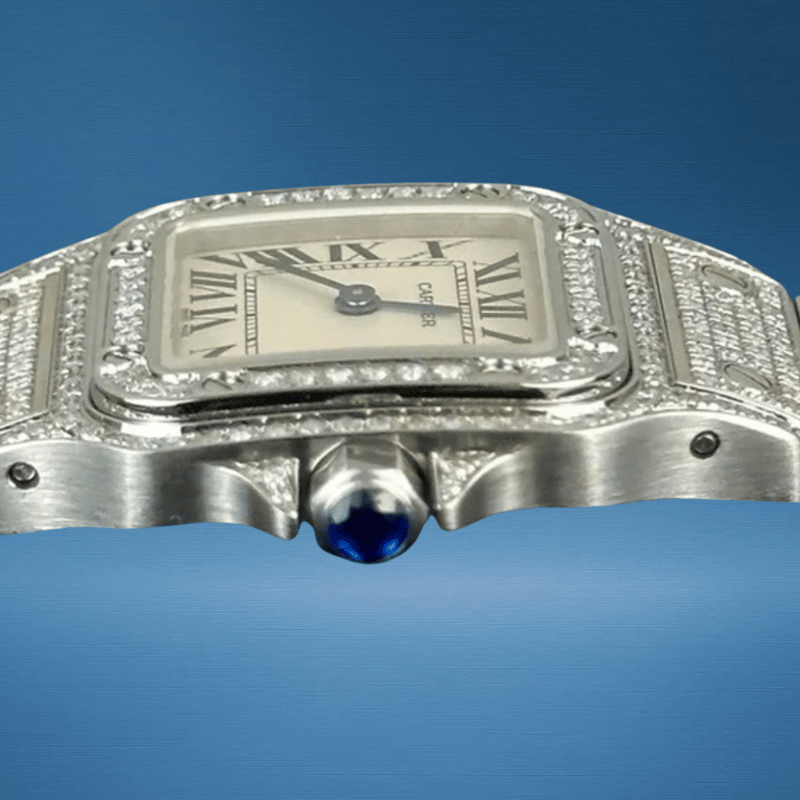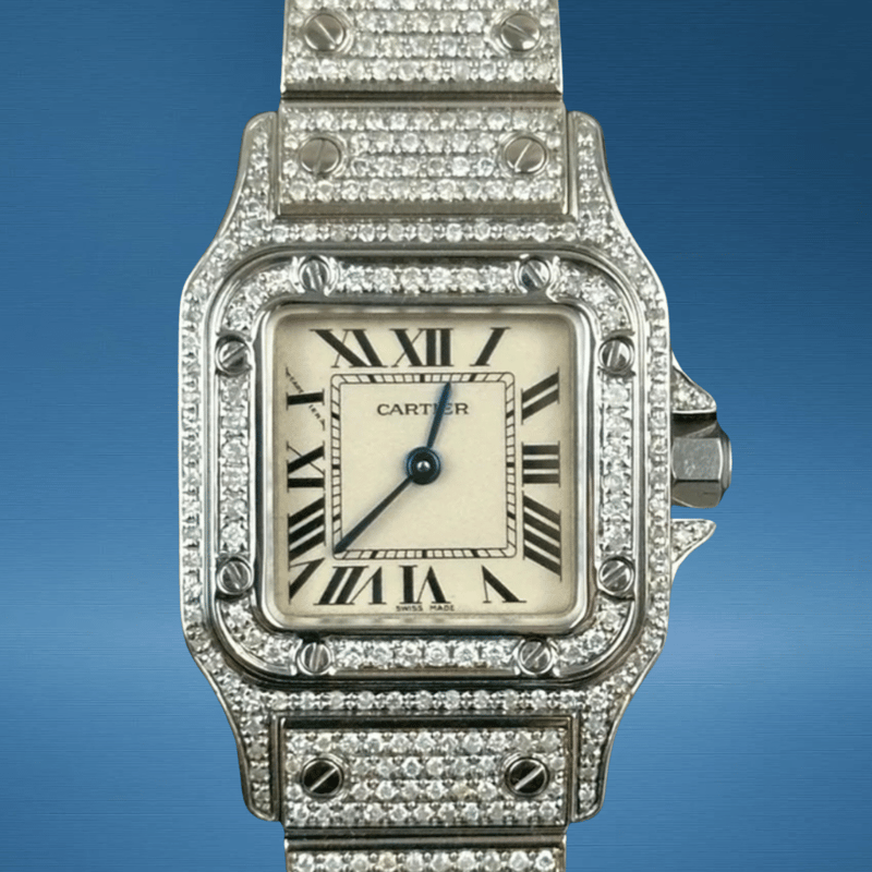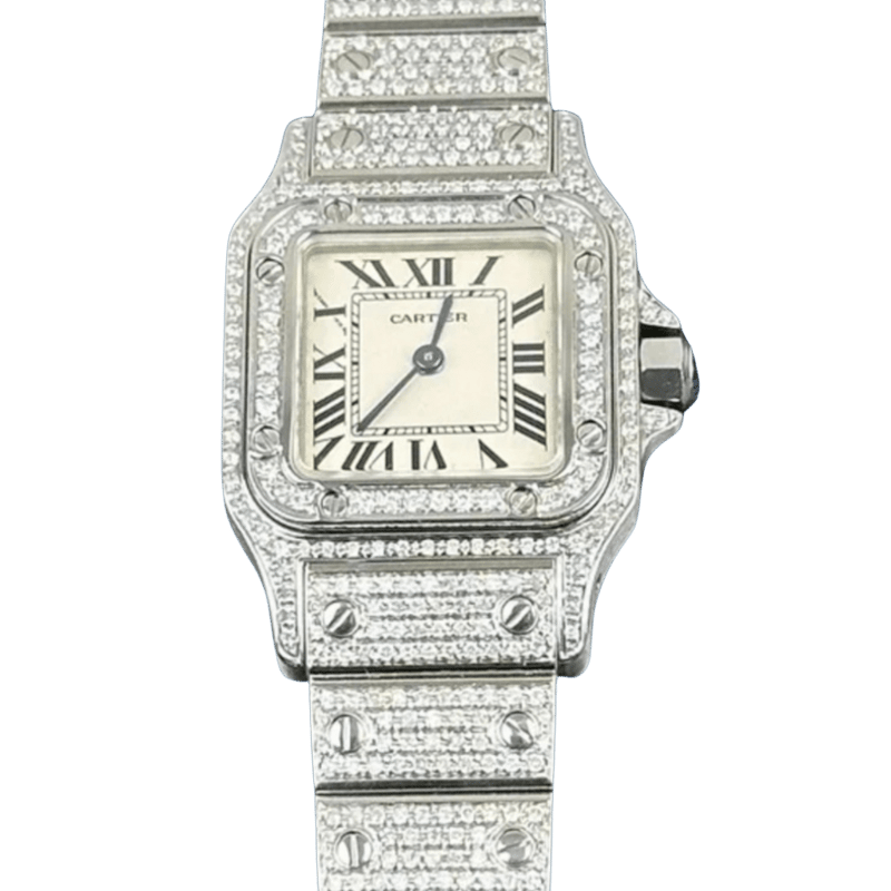 CARTIER SANTOS GALBEE 1565 QUARTZ CUSTOM DIAMOND Brand: Cartier Model Number: GALBEE Reference Number: 1565 Production Year: UNKOWN Dial: WHITE Case: STEEL / DIAMOND Case Size: 24MM Bracelet: STEEL& DIAMOND Movement: QUARTZ Aftermarket Natural DiamondsBox: Not IncludedPapers: Not Included Condition: Good - Refer to Images