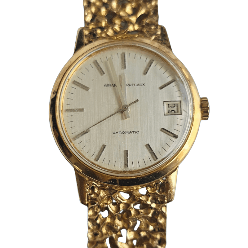 GIRARD PERREGAUX 9KT GOLD GYROMATIC 34MM VINTAGE CUSTOM 9KT GOLD BRACELET Brand: Girard Perregaux Model Number: GYROMATIC Production Year: UNKNOWN Dial: SILVER Case: 9KT GOLD Case Size: 34MM Bracelet: 9KT GOLD Movement: AUTOMATIC Box: Not IncludedPapers: Not Included Condition: Good - Refer to Images
