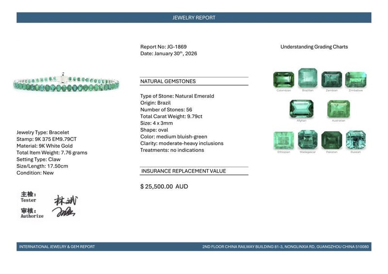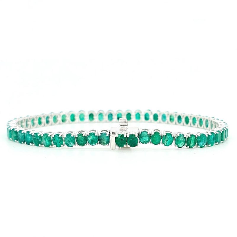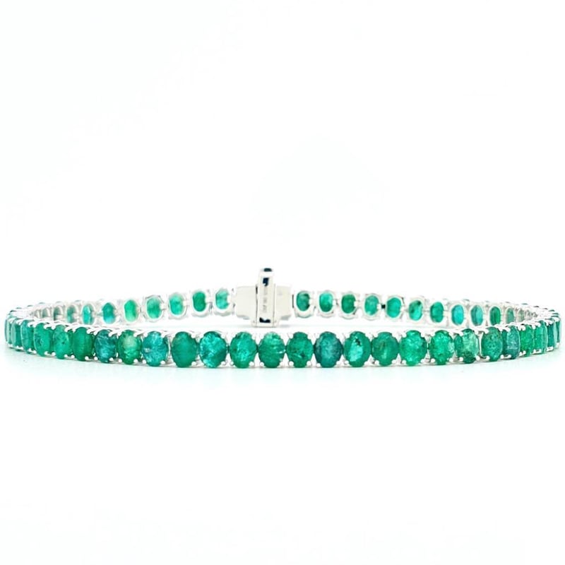 9CT WHITE GOLD BRAZILIAN EMERALD TENNIS BRACELET Featuring, 56 Oval Cut, Medium Bluish-Green Brazilian Emeralds (9.79Ct Tsw, Moderate-Heavy Inclusions), Claw Set. Bracelet Length Is 17.50Cm. Valuations Provided by an Independent Third-Party Professional Not Directly Associated With Lloyds Auctions at AUD $25500This valuation has been conducted by an independent third-party professional. The valuation amount is an assessment by the issuing valuer and does not reflect the auction value of the item. Any inquiries regarding the valuation should be directed to the issuing valuer (refer to contact details on the certificate), as Lloyds Auctions has no affiliation or influence over the valuation, the valuer, or the stated amount. Condition: Good - Refer Images 0582870+654