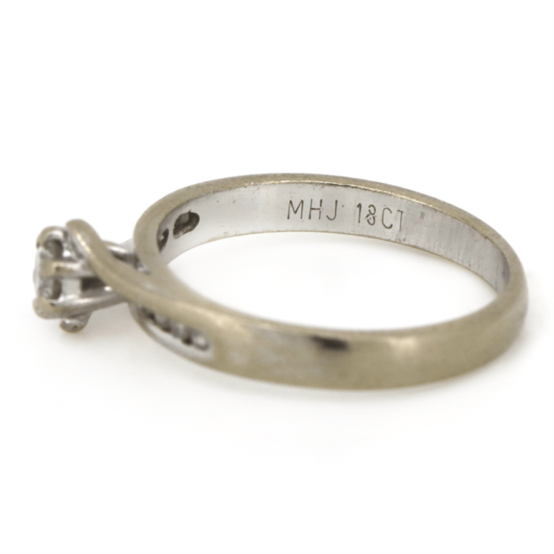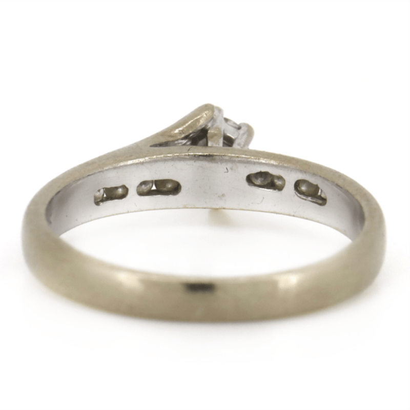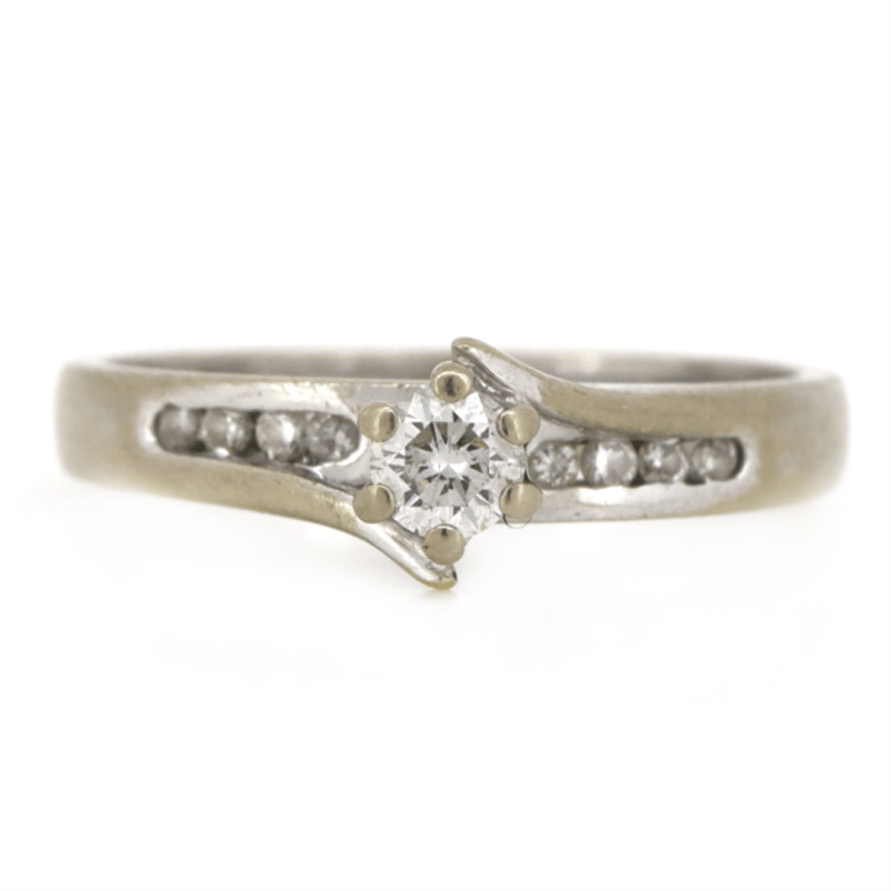 The Centre Features, One Round Brilliant Cut, Diamond (0.25Ct Tdw, I-J Colour, Si2 Clarity) Claw Set. Along The Sides Are, 8 Round Brilliant Cut, Diamonds (0.08Ct Tdw, I-J Colour, Si1-Si2 Clarity), Channel Set. Ring Size L. Condition: Pre-Owned.