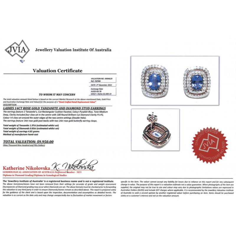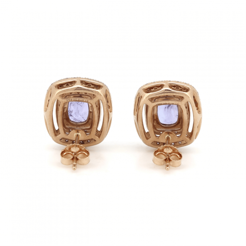 The Centres Feature, 2 Rectangular Cushion Faceted Cut, Purplish-Blue, Tanzanites (1.97Ct Tsw, Included), 4 Claw Set. Surrounding The Centres In Double Halos Are, 100 Round Brilliant Cut, Diamonds (0.83Ct Tdw, I-K Colour, P1-P2 Clarity), Claw Set. The Earrings Have Post Backs, With 14K Rose Gold Butterfly Clasps.