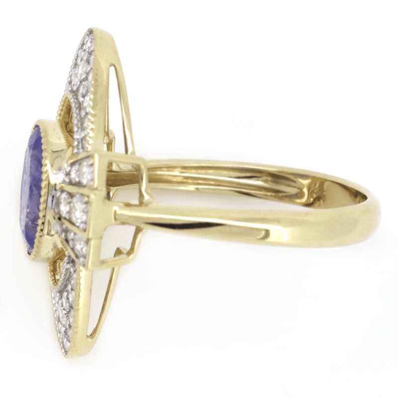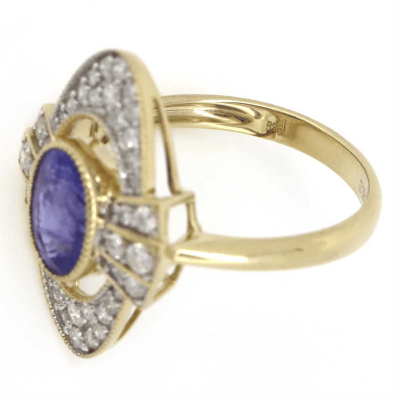 14K YELLOW GOLD, TANZANITE AND DIAMOND, DECORATIVE RING.