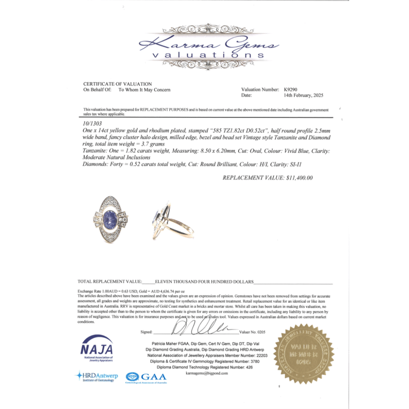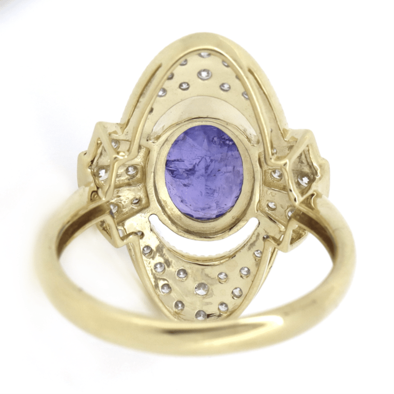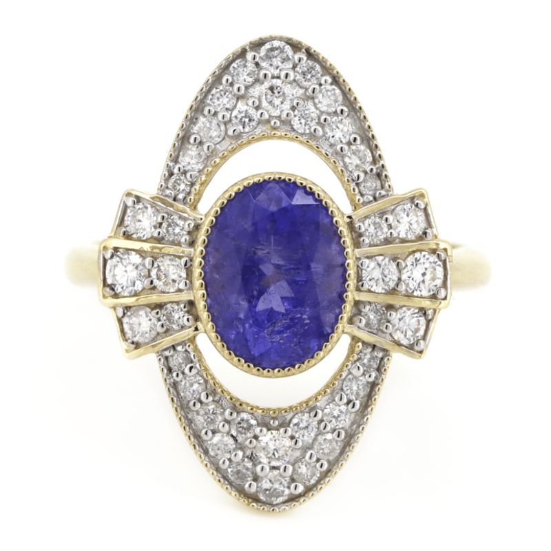 The Centre Features, One Oval Cut, Vivid Blue, Tanzanite (1.82Ct, Moderate Natural Inclusions), Bezel Set. Surrounding The Centre Are, 40 Round Brilliant Cut, Diamonds (0.52Ct Tdw, H-I Colour, Si-I1 Clarity), Claw Set. Ring Size N.