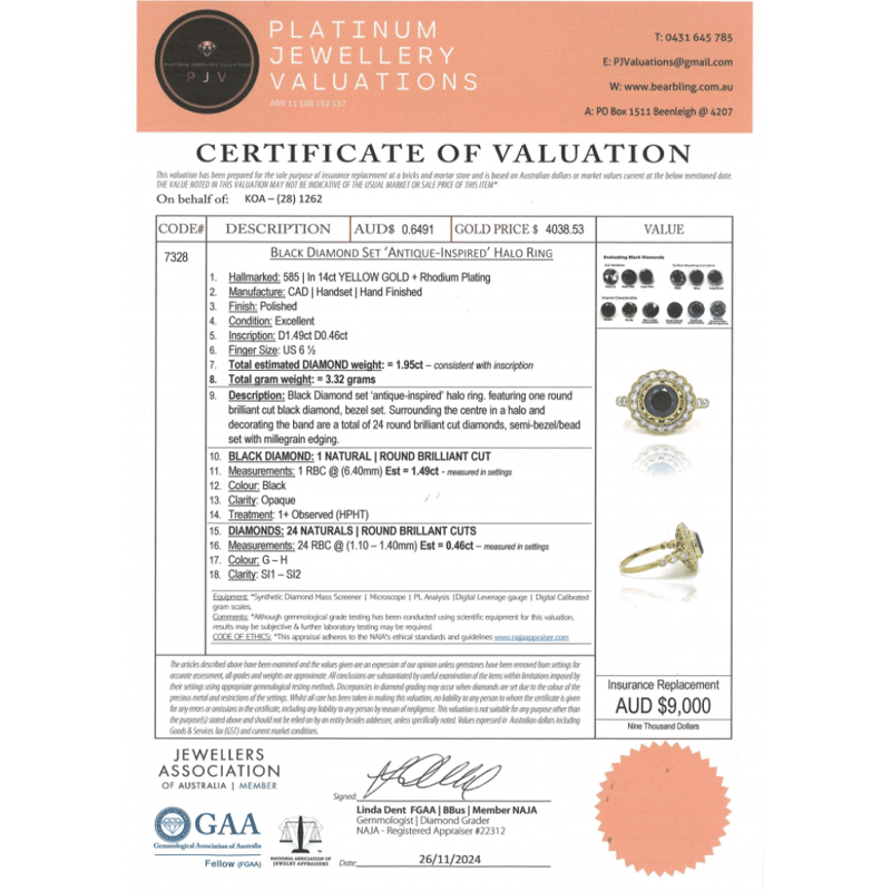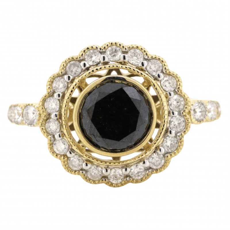 The Centre Features, One Round Brilliant Cut, Black, Diamond (1.49Ct, Opaque Clarity, Hpht Enhanced), Bezel Set. Surrounding The Centre In A Halo And Decorating The Band Are, 24 Round Brilliant Cut, Diamonds (0.46Ct Tdw, G-H Colour, Si1-Si2 Clarity), Semi-Bezel/Bead Set. The Centre Settings Have Been Detailed With Millegrain Edging. Ring Size M 1/2.