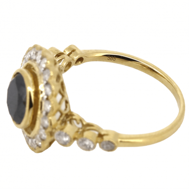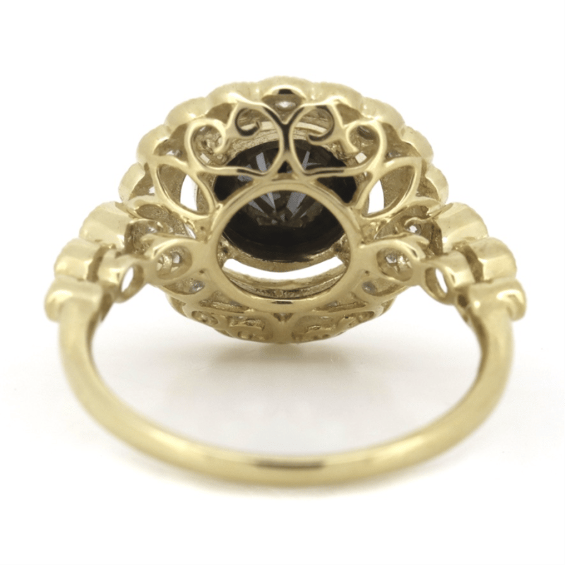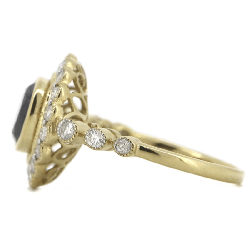 14K YELLOW GOLD, BLACK DIAMOND AND DIAMOND, ANTIQUE INSPIRED RING.