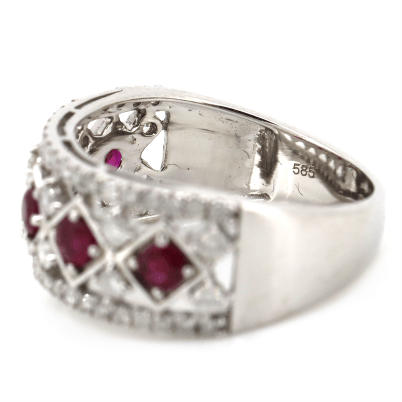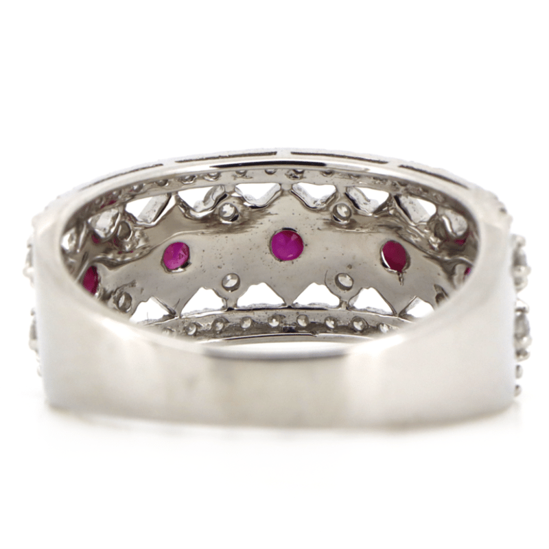 14K WHITE GOLD, RUBY AND DIAMOND, MULTI-ROW STATEMENT RING.
