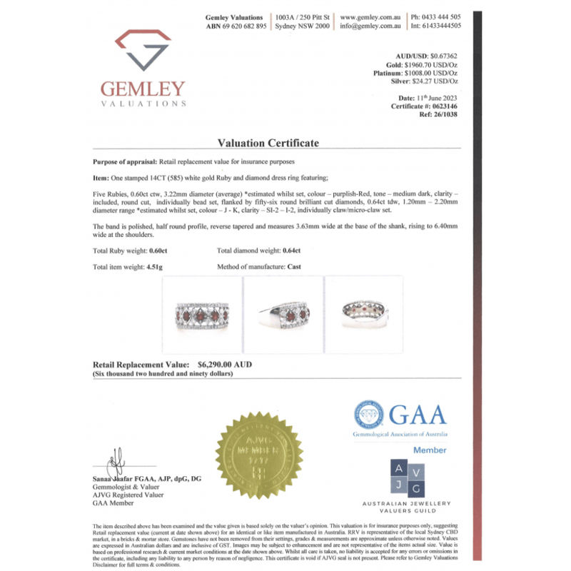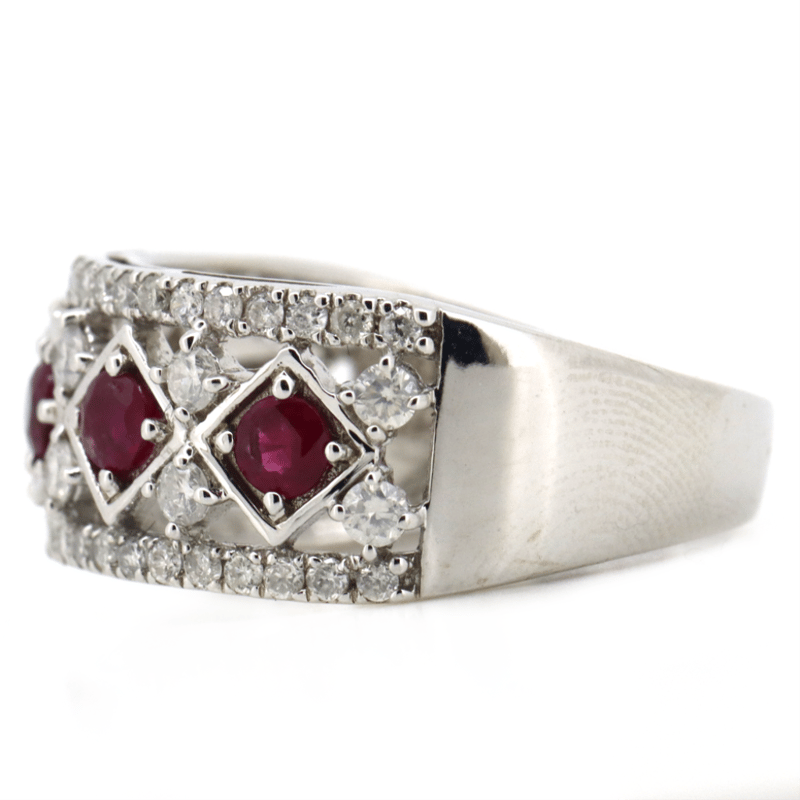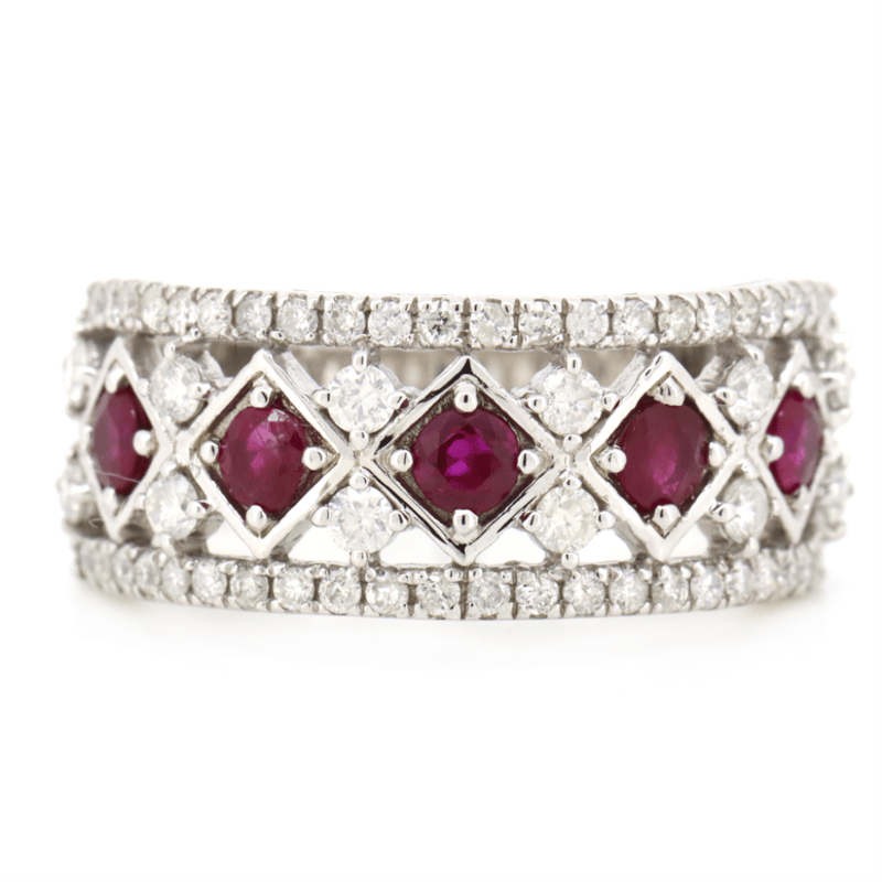 The Design Features, 5 Round Cut, Purplish-Red, Rubies (0.60Ct Tsw, Included), Bead Set. Bordering The Design Are, 56 Round Brilliant Cut, Diamonds (0.64Ct Tdw, J-K Colour, Si2-I2 Clarity), Claw/Micro-Claw Set. Ring Size N.