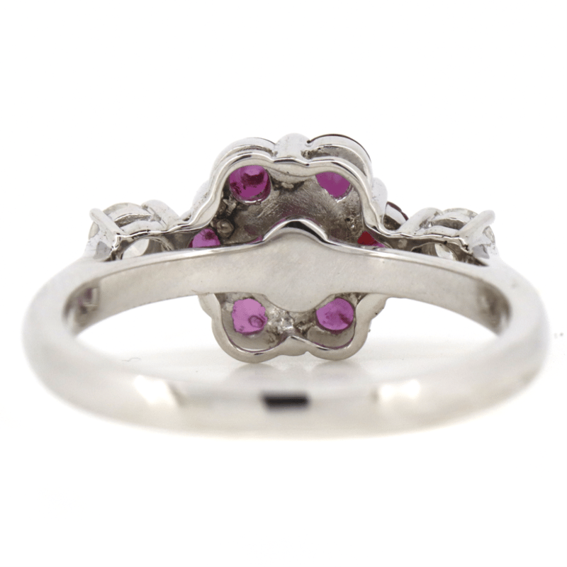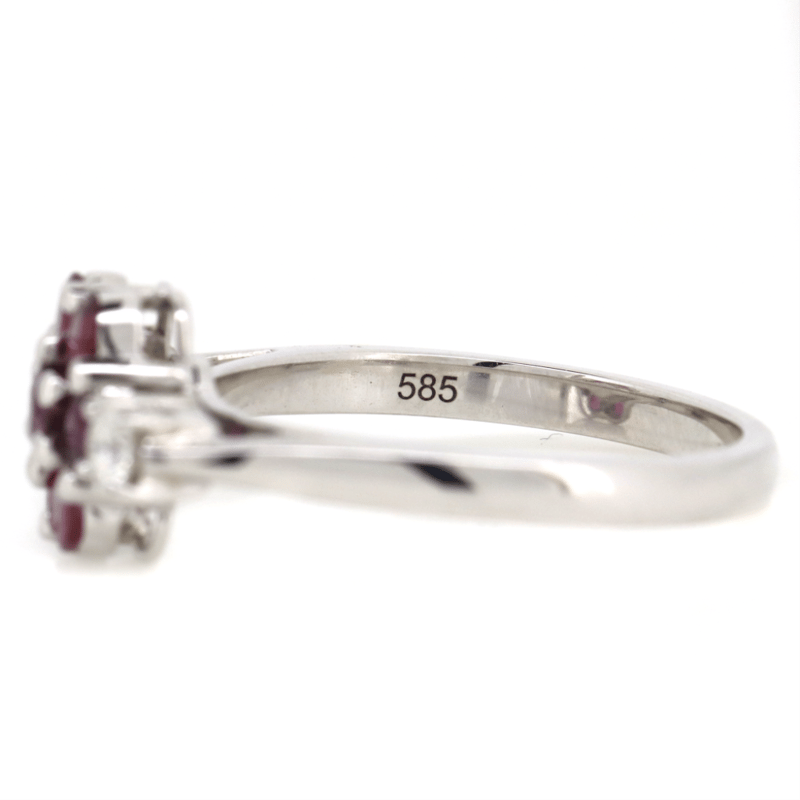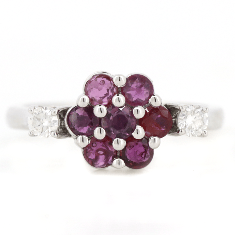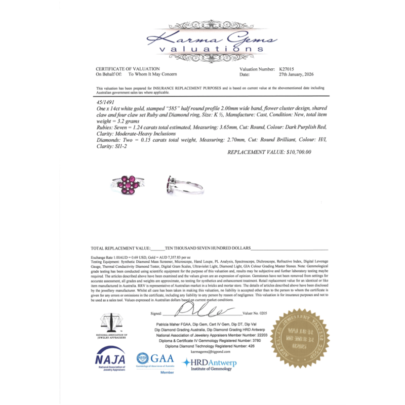 14K WHITE GOLD, RUBY AND DIAMOND, FLOWER RING. The Centre Features, Seven Round Cut, Rubies (1.24Ct Tsw, Moderate - Heavy Inclusions), Claw Set. Flanking The Centre Are, 2 Round Brilliant Cut, Diamonds (0.15Ct Tdw, H-I Colour, Si1-2 Clarity), Claw Set. Ring Size K 1/2. Valuations Provided by an Independent Third-Party Professional Not Directly Associated With Lloyds Auctions at AUD $$10,700.00This valuation has been conducted by an independent third-party professional. The valuation amount is an assessment by the issuing valuer and does not reflect the auction value of the item. Any inquiries regarding the valuation should be directed to the issuing valuer (refer to contact details on the certificate), as Lloyds Auctions has no affiliation or influence over the valuation, the valuer, or the stated amount. Condition: Good - Refer Images 0645953+1632