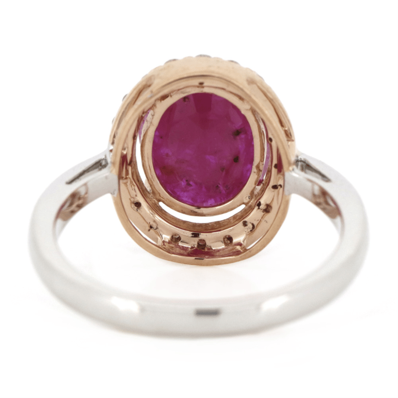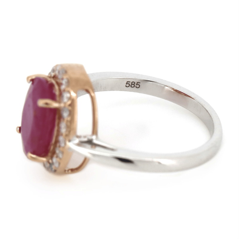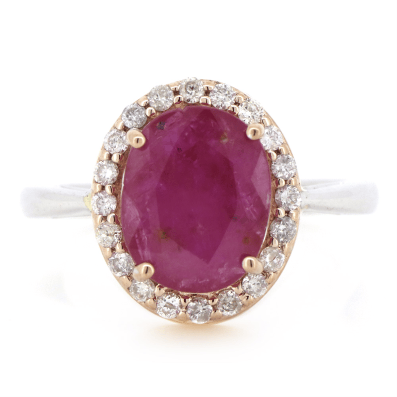 14K ROSE/WHITE GOLD, RUBY AND DIAMOND, HALO RING.