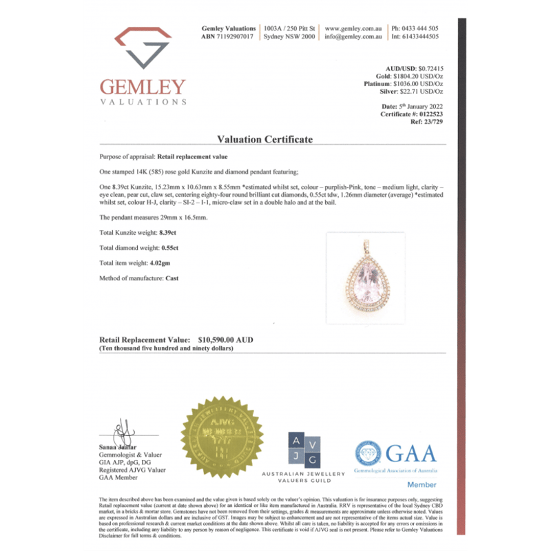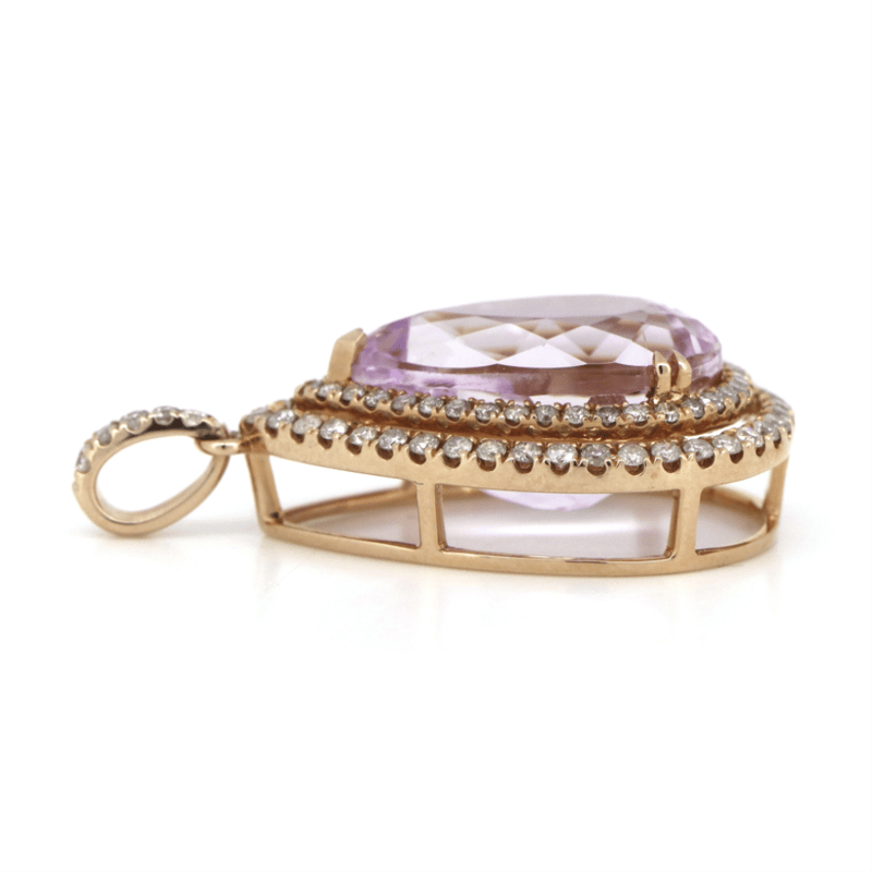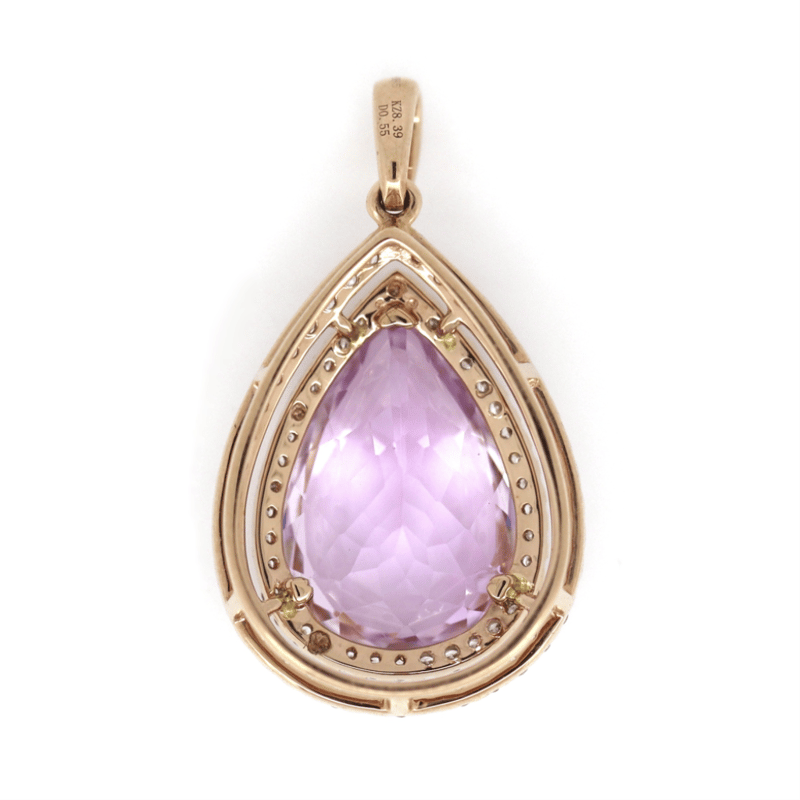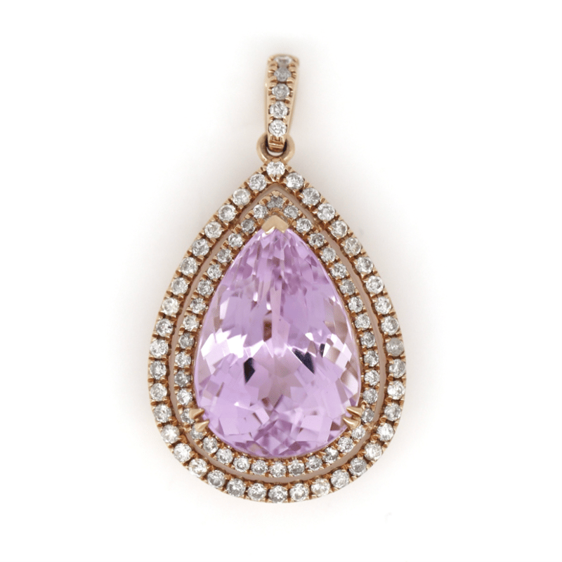 The Centre Features, One Pear Cut, Medium Light Purplish-Pink, Kunzite (8.39Ct, Eye Clean Clarity), 3 Claw Set. Surrounding The Centre In A Double Halo And Decorating The Bail Are, 84 Round Brilliant Cut, Diamonds (0.55Ct Tdw, H-J Colour, Si2-I1 Clarity), Micro-Claw Set.